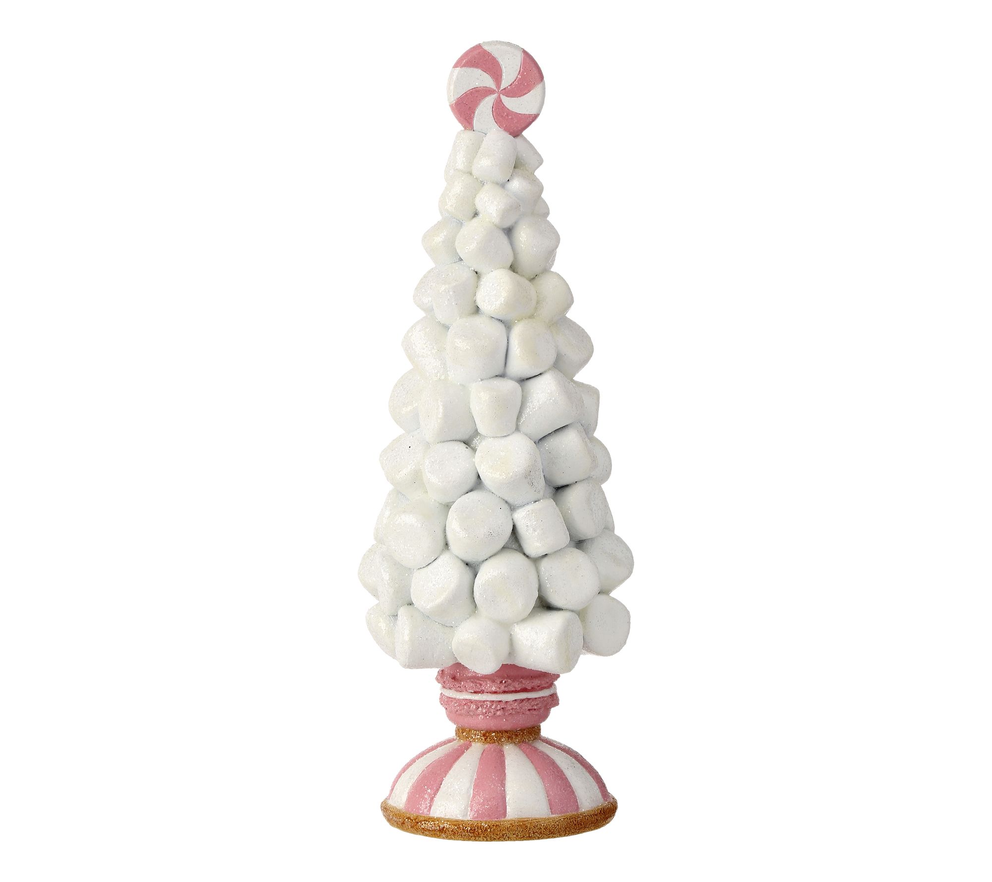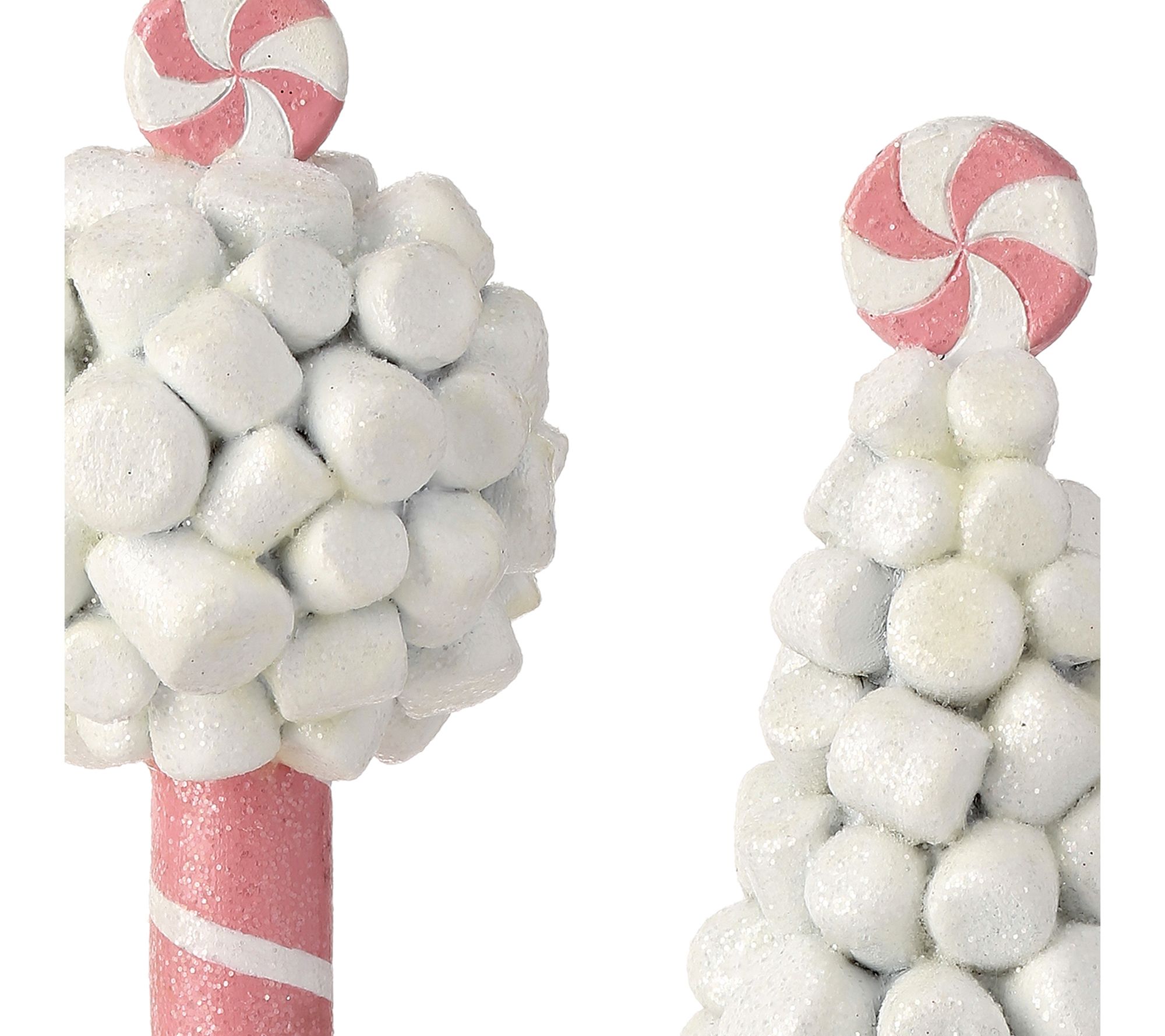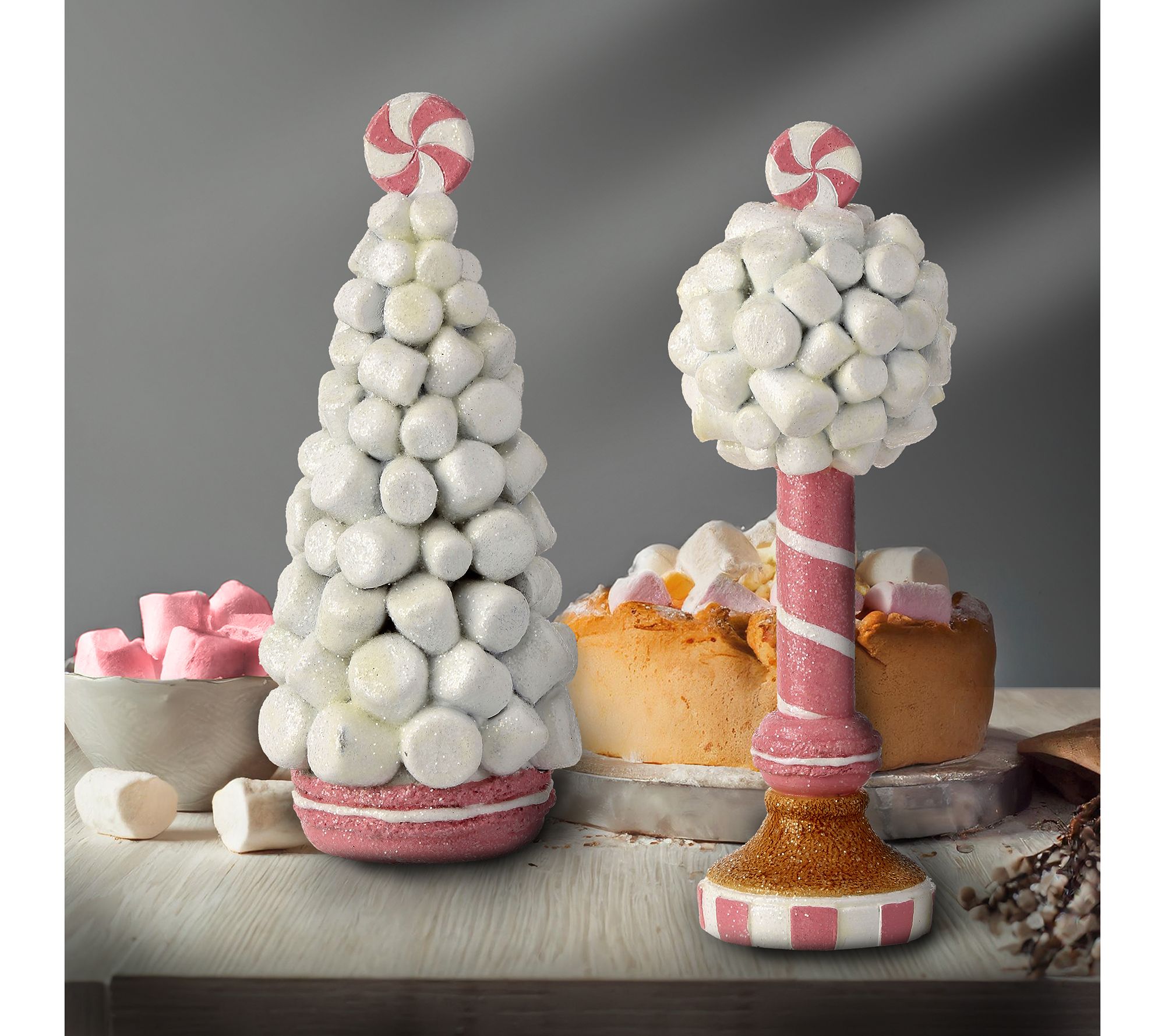 Indulge in the whimsical charm of the 8.5" marshmallow tree topiary set by Valerie. Perfect for adding a sweet touch to your holiday decor, each piece features delightful details like a macaroon base and peppermint toppers. These adorable tabletop decorations are crafted from high-quality resin and finished with a sugared sparkle, making them a must-have for any festive setting. From the Valerie Parr Hill Collection.
