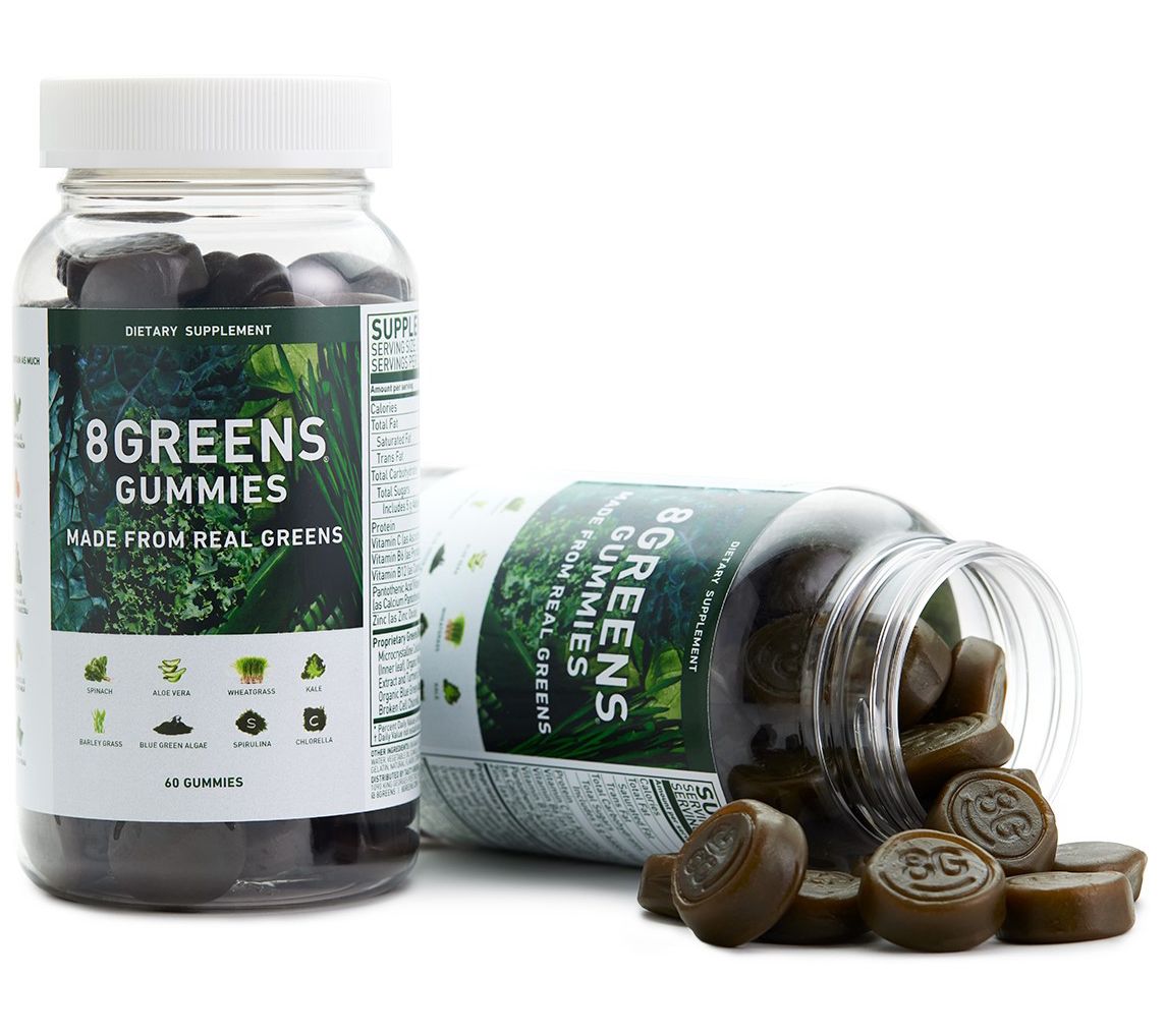 • Two 8Greens Gummies have the same vitamins and greens as the 8Greens tablet