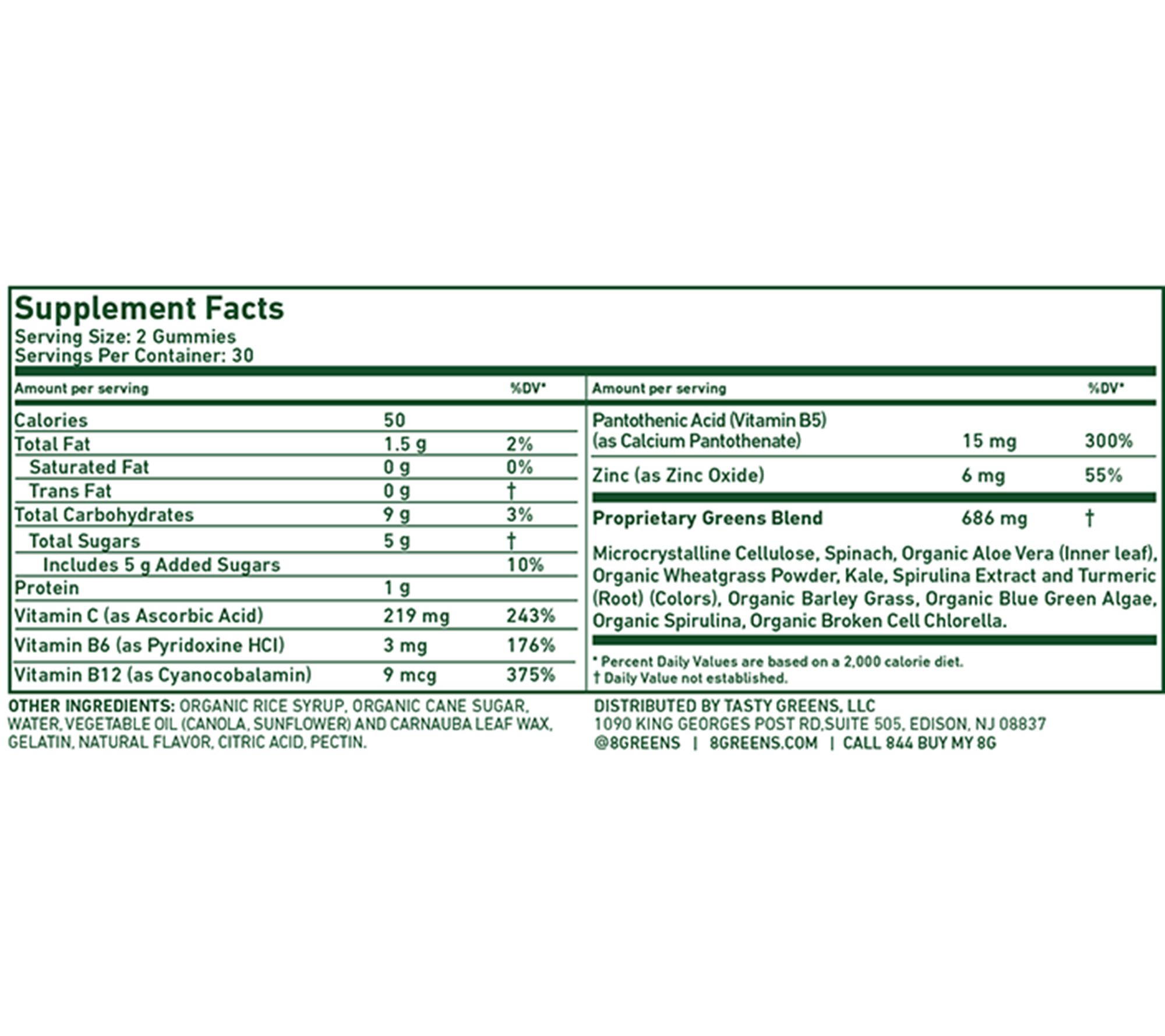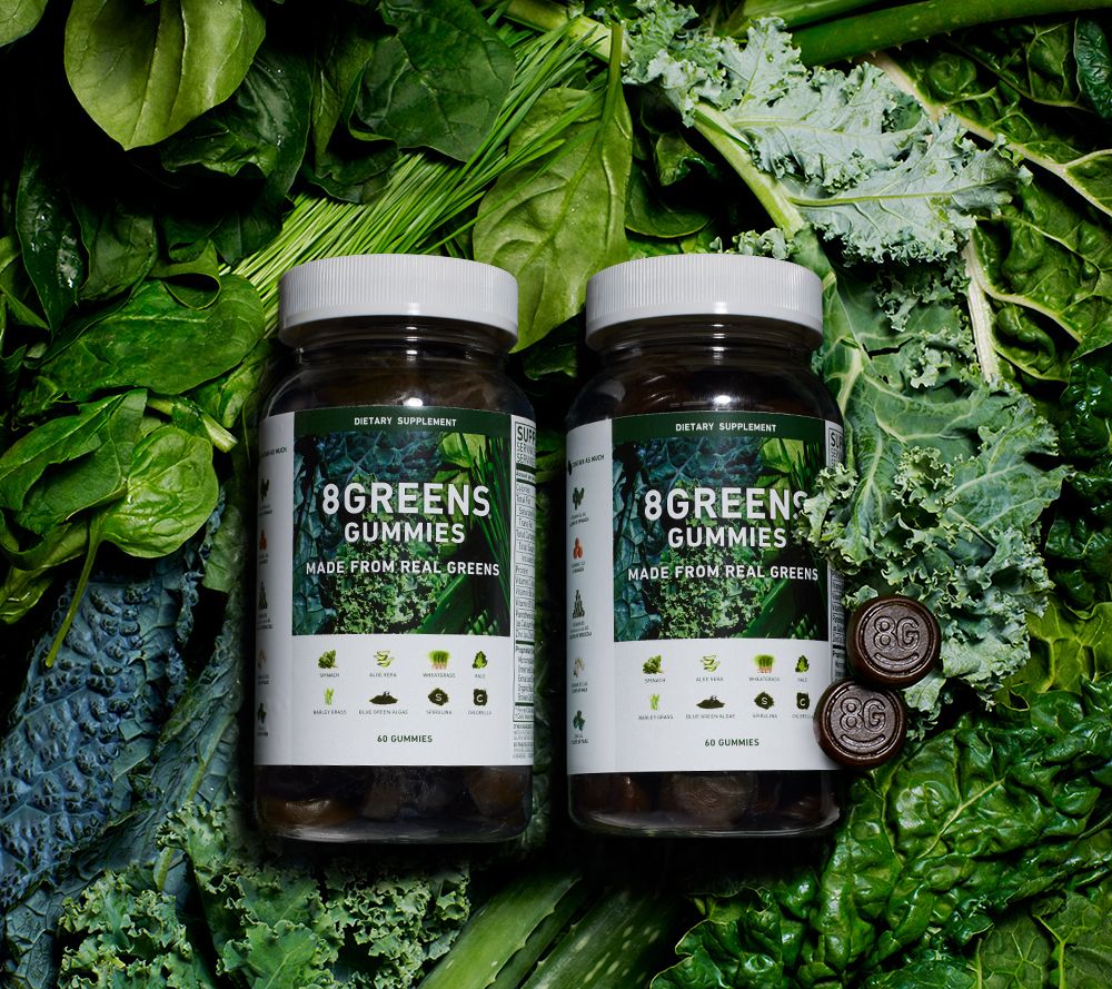 • Two 8Greens Gummies contain as much vitamin B5 as 15 cups of broccoli