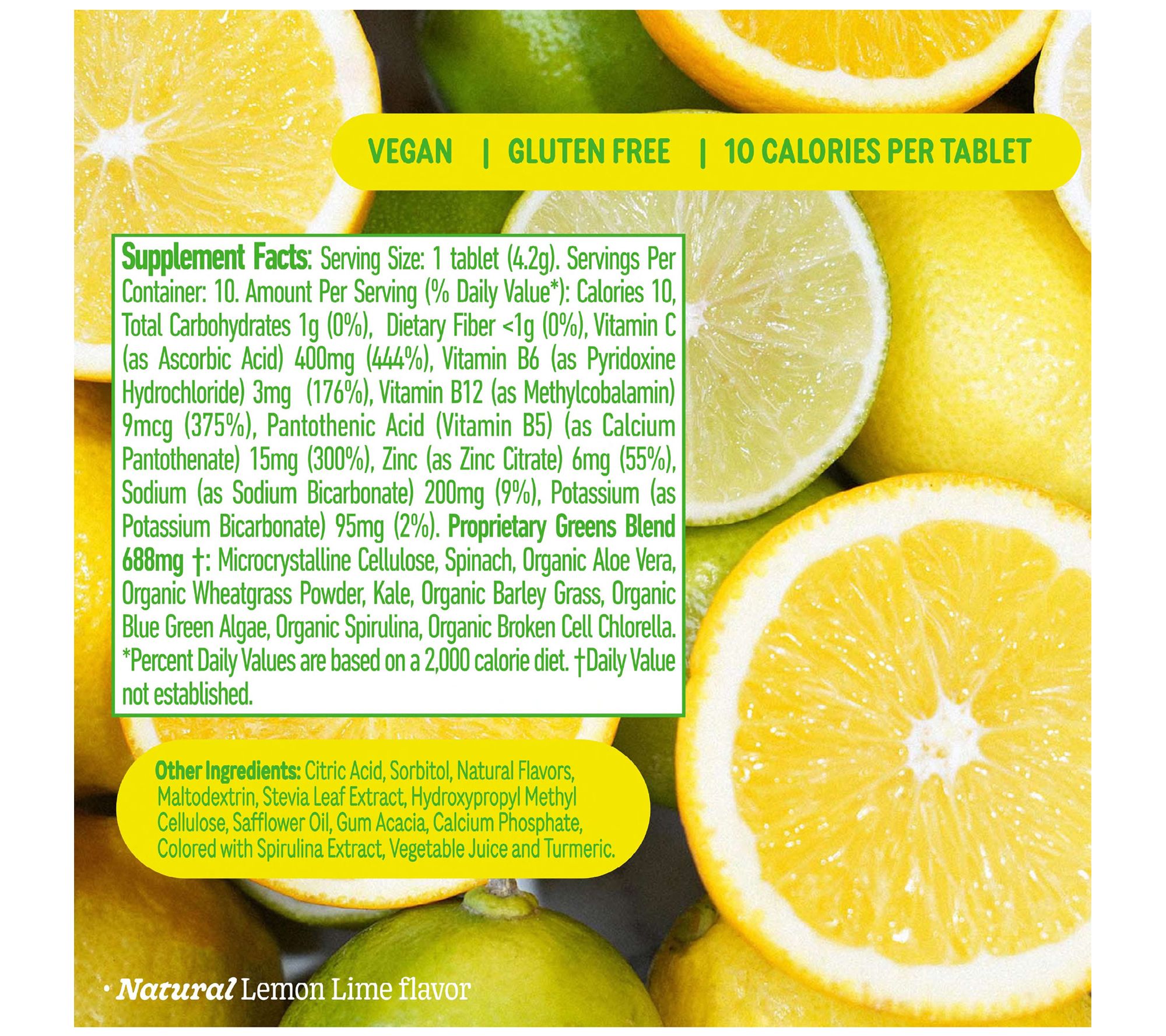 Tablets and gummies contain organic aloe vera, wheatgrass powder, barley grass, blue-green algae, spirulina, and chlorella