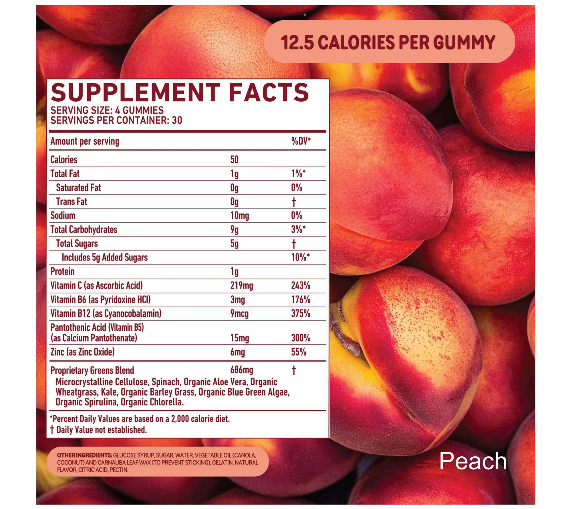 Four gummies or one tablet have 9mcg of vitamin B12, which is the same amount of B12 contained in seven cups of milk, providing 375% of the recommended daily value for B12