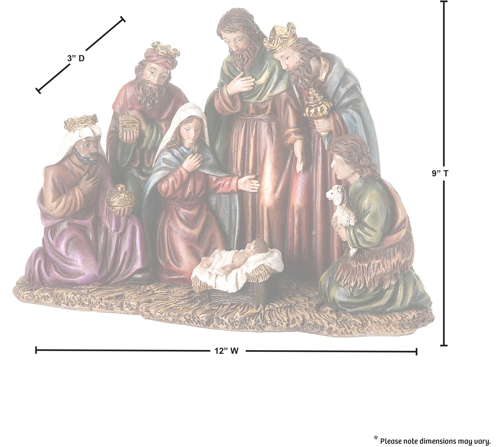 Celebrate Christmas with this beautifully designed 9" nativity piece by Valerie. Crafted from resin in multi-colored hues, it makes a perfect centerpiece and can also spruce up any mantel or shelf setting. From Valerie Parr Hill Collection.