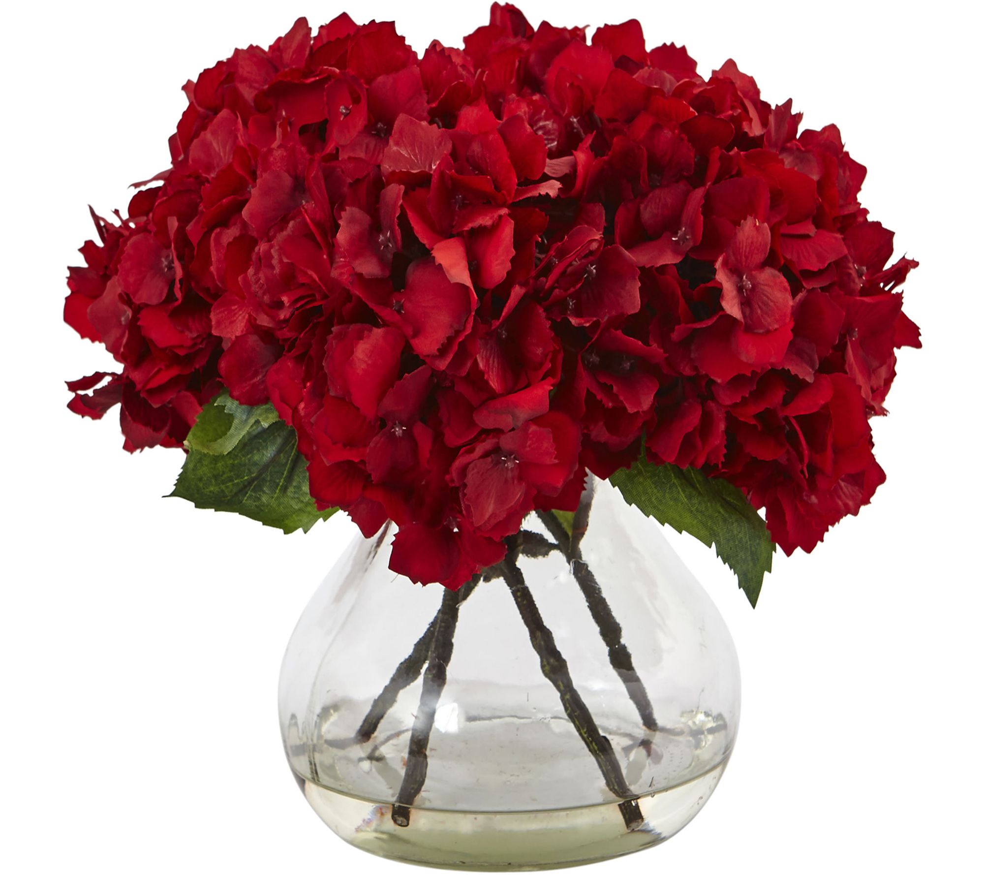 • Lifelike red hydrangea in Liquid Illusion faux water vase