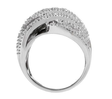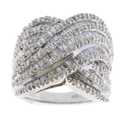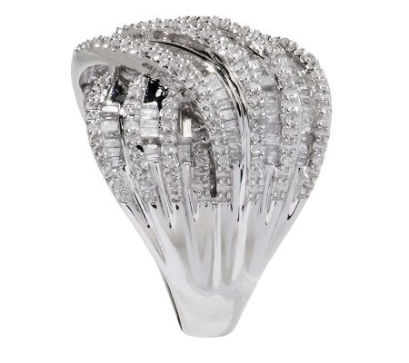 Bold and brilliant. If you have an affinity for diamonds, this sterling silver ring is for you. Glistening with baguette, channel-set and round, prong-set white diamonds in a crossover design, this ring will be the centerpiece of any look. From Affinity(R) Diamond Jewelry.