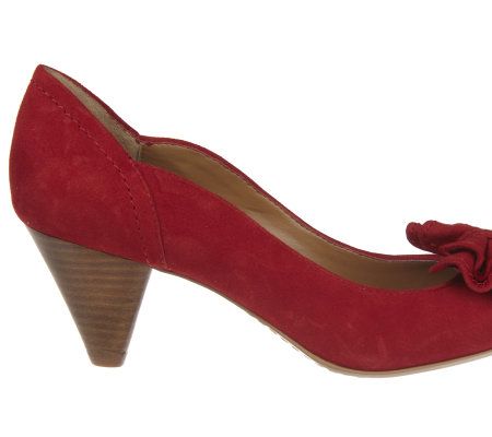 Bowed over. A lovely bow details the vamp of these exquisite leather and suede pumps. The stacked heel and stitching around the bow and along the back finish off their fresh look. From B. Makowsky Footwear.