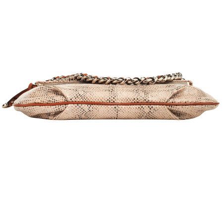 • Chain detail on shoulder strap; back slip pocket; front foldover zip pocket; magnetic slip closure