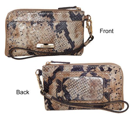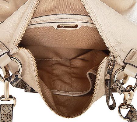 It's gorgeous, inside and out. Goldtone hardware accents gleam against the soft and durable pebble leather for sophisticated glamour that's always stylish, and two choices--Black and Vanilla--are trend-right with trim in python-design leather. Exterior vertical zipper pockets and a cell phone slip pocket on the back offer easy-access stow space. Inside, the handsome twill lining in a neutral color makes it easy to spot your belongings inside.
