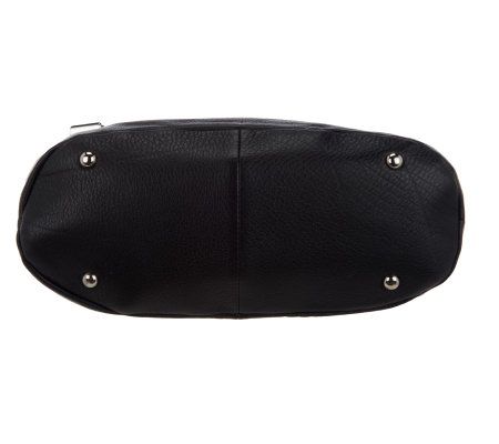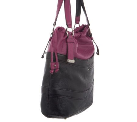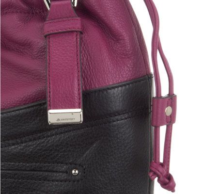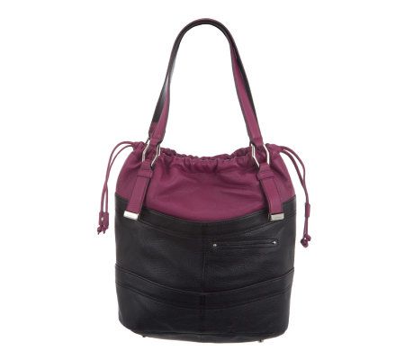 Practicality with pop. Boasting two embossed leather textures, this pebble leather drawstring shopper helps you stand out while staying put-together. Interior and exterior pockets offer plenty of places to stash your essentials, while a fully elasticized top with magnetic snap closure provides a stylish way to secure the bag. From B. Makowsky.
