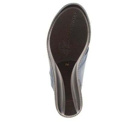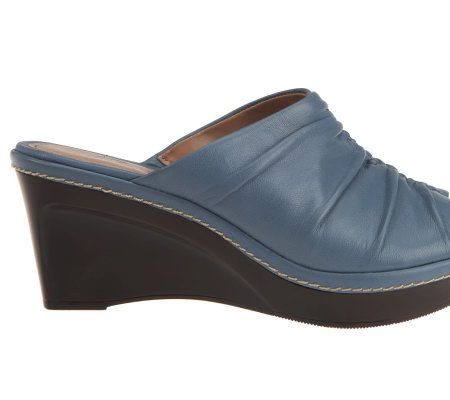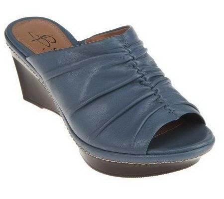 Slide into something different. Ruched detail lends these leather wedge slides a fashionable look to go with your warm-weather wardrobe favorites. From B. Makowsky Footwear.