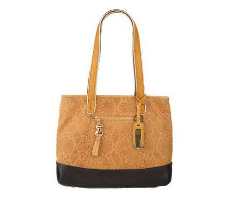 Hands on. With this snake-embossed leather shopper in your grip, you can be a glamour girl whether you're going to the store or out for a fancy dinner. Zip pockets both inside and out make it practical and posh. From B. Makowsky.