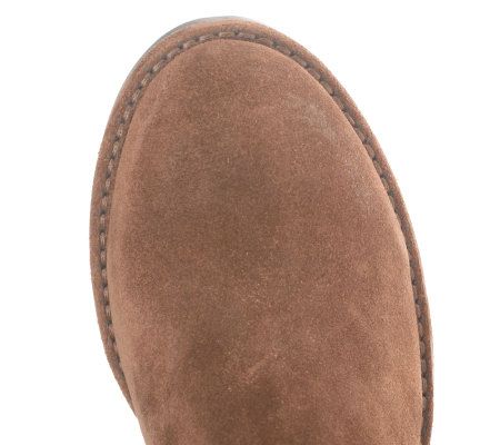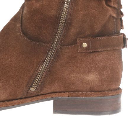 That hole in your heart left by your favorite summer sandals is sure to be filled the second you slip into these sumptuous suede boots. The tall shaft is accentuated by ruching details on the front and back, as well as chic buckle accents. An inside zip ensures easy on and off--without detracting from the fabulous silhouette. From B. Makowsky Footwear.