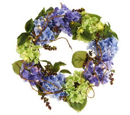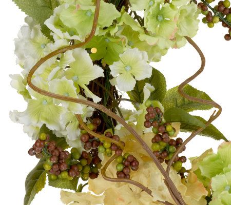 A splash of spring. Realistic hydrangeas are intertwined with faux berries and grapevine sprays to create a wreath that fits into any decor. From Bethlehem Lights.