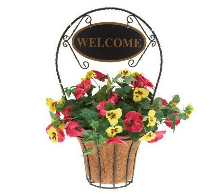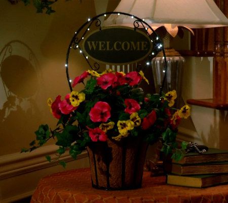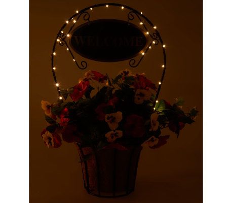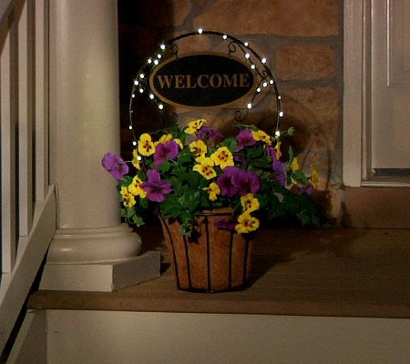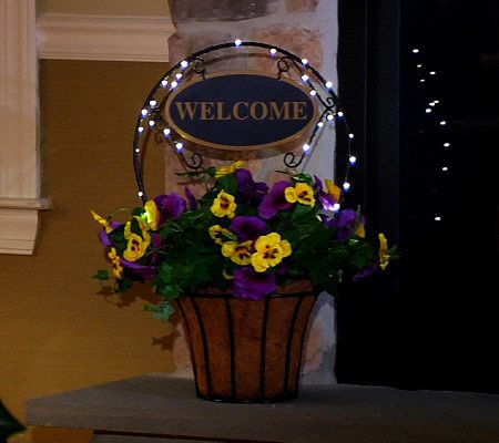 Warm welcome. Whether placed on a porch or foyer table, this lovely planter sure makes you and your guests feel right at home. The basket is filled with lifelike pansies and leaves, highlighted by a decorative arch with a welcome sign. For added ambience, 30 LED lights are placed around the arch, and they can be set to glow steadily or put on a timer so they illuminate for six hours at the same time each evening. From Bethlehem Lights.