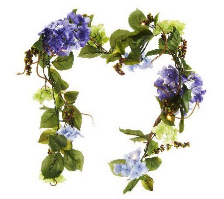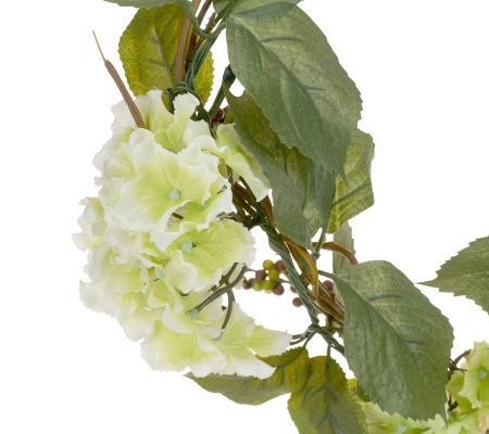 A splash of spring. Realistic hydrangeas are intertwined with faux berries and grapevine sprays to create this decorative garland. From Bethlehem Lights.