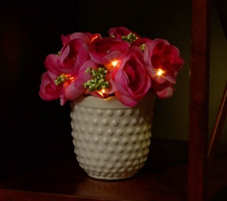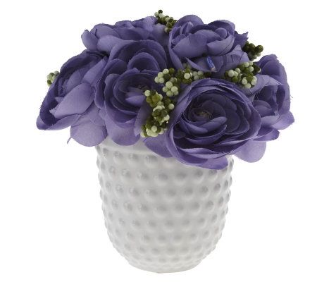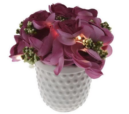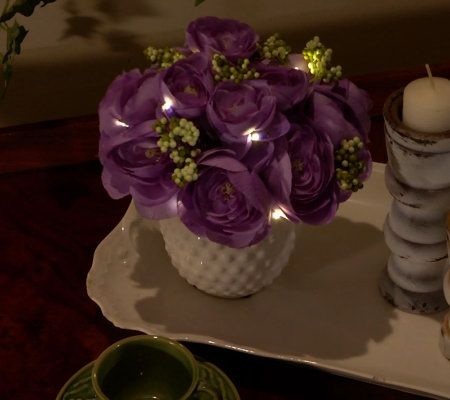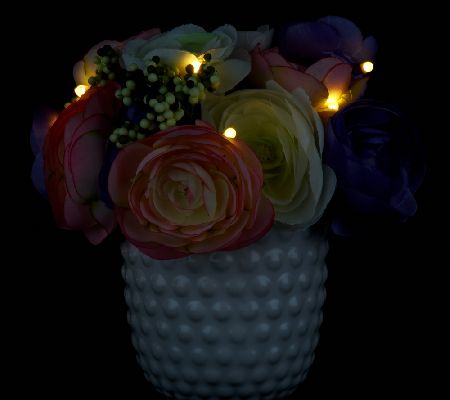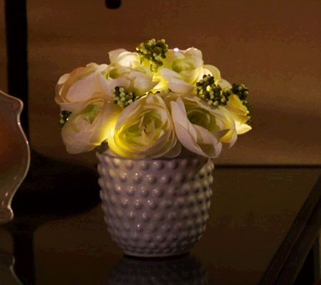 Elegant in any room, this arrangement combines fabric ranunculus flowers and clusters of petite faux berries in a textured, milky white ceramic vase. 10 LED lights glow softly, interspersed among the lovely stems. From Bethlehem Lights.