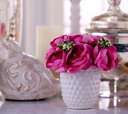 Fabric ranunculus flowers and clusters of petite faux berries in a milky white ceramic vase with hobnail texturing