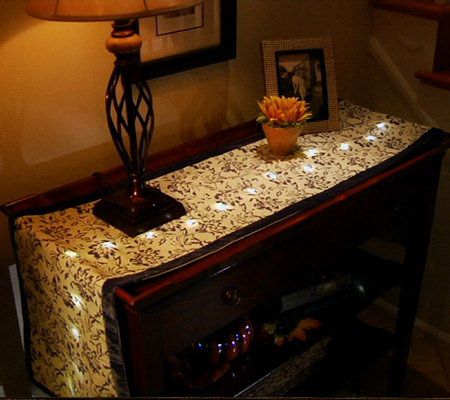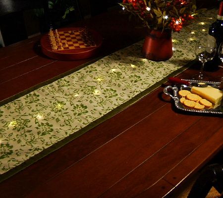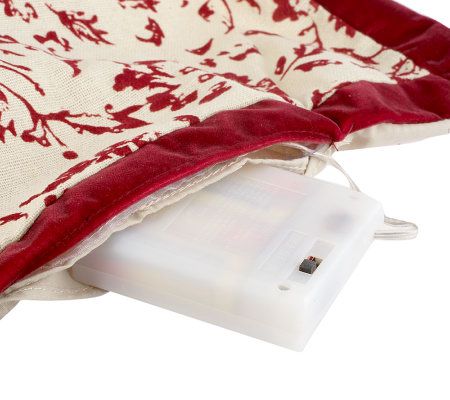 Standing out with an elegant flocked floral pattern, this gorgeous table runner is edged with a solid velvet border. Shining through the fabric is the soft glow of 20 LED lights. From Bethlehem Lights.