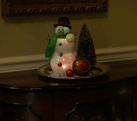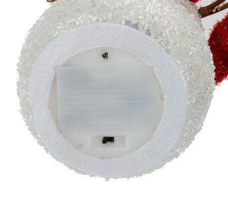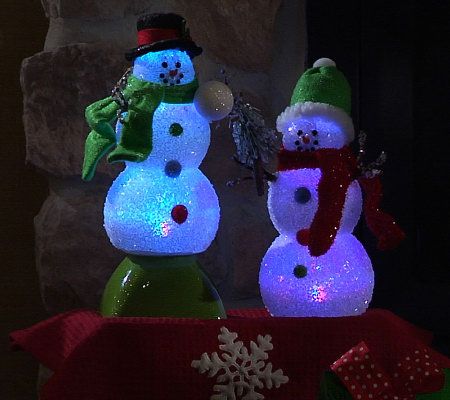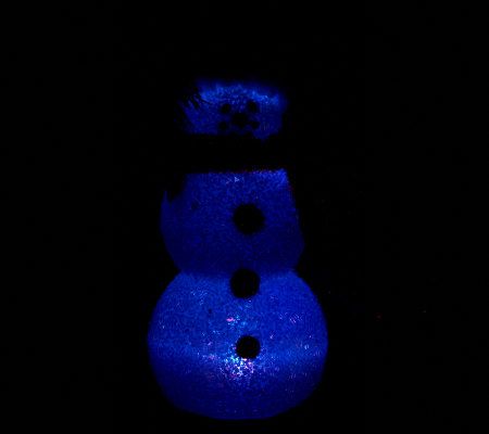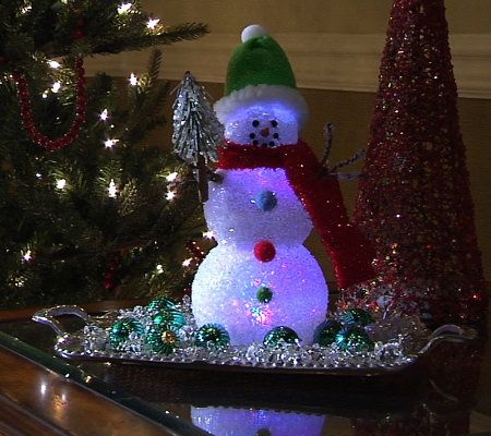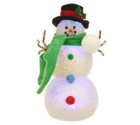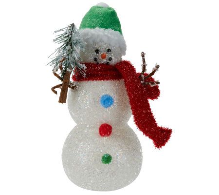 Dressed in classic holiday garb, including a decorative fabric scarf and hat, with three gumdrop buttons, this Christmas staple is adorned with classic snowman features like coal eyes, a carrot nose, and twig arms. The sparkling snowman uses an internal LED light to change colors. From Bethlehem Lights.