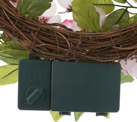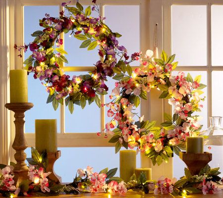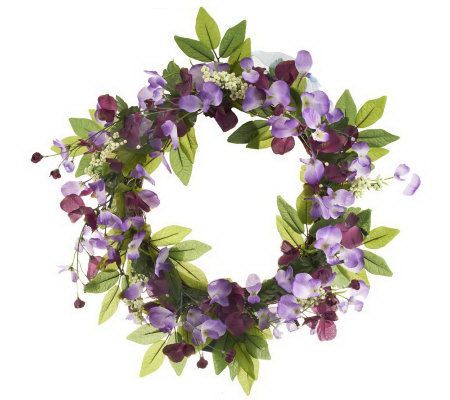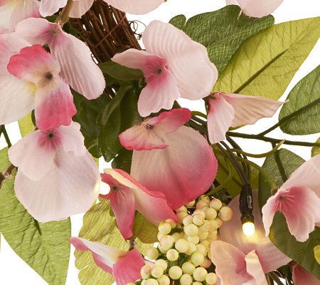Springtime shine. Adorned with lifelike sweet pea flowers, faux berries, and faux leaves, this delightful wreath helps dress your home for the season. It also brightens with 20 LED lights, which you can easily operate using the timer. From Bethlehem Lights.