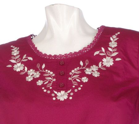 Pretty, please! With dainty details like floral embroidery and decorative buttons, this woven tunic is the sugar on top of your sweetest ensemble. From Denim & Co.(R) Fashions.