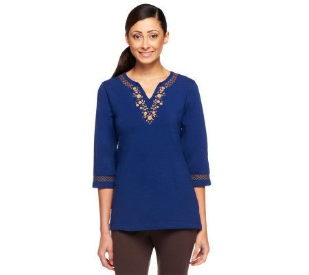 Delicious topping. Just like everything tastes great with vanilla ice cream, everything looks great with this embroidered split-neckline top. It's the cherry-on-top to whatever you wear. From Denim & Co.(R) Fashions.
