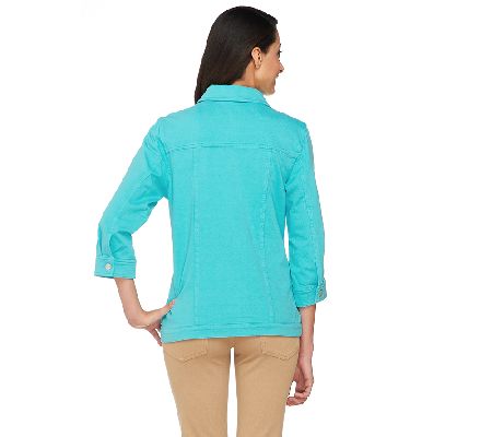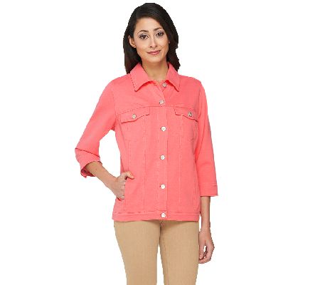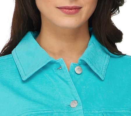 Throw and go. Complete with classic touches, like a collar, button closure, and functional pockets, this Denim & Co. "Comfy Denim" denim jacket is ideal for errands and outings. From Denim & Co.(R) Fashions.