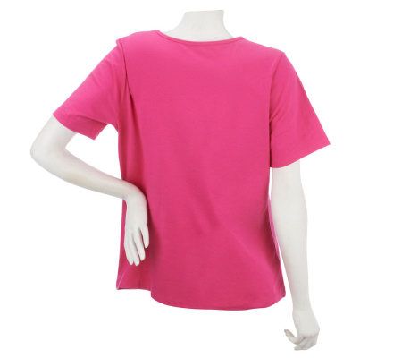 Ring around the rosy. A sweet flower and keyhole accent add whimsical details to this short-sleeved top, which looks adorable with colored or denim jeans. From Denim & Co.(R) Fashions.