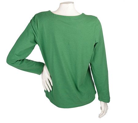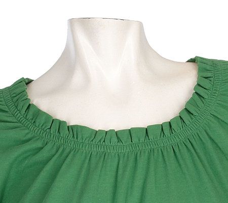 Lookin' lovely. Elastic along the scoop neckline of this top helps to create a gathered look that's very of-the-moment. The neckline is further enhanced by pique stitching and a lettuce edge. From Denim & Co.(R) Fashions.