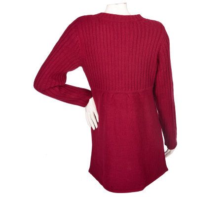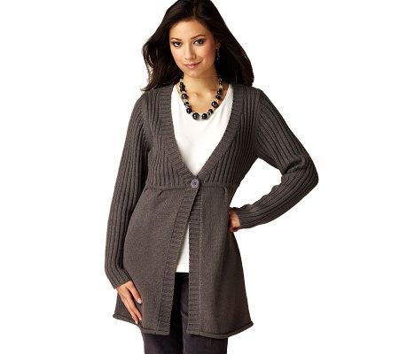 Fashioned with a V-neckline and empire waist, this cozy one-button cardigan has a sneaky way of making legs appear miles long. Ribbed detailing lends eye-catching texture throughout. From Denim & Co.(R) Fashions.