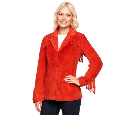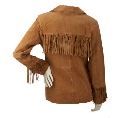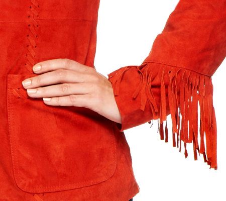 Stay on the fringe. Get a little funky with some fringed trim on this very wearable, fully lined suede jacket. Keep it looking great easily with washable, dryable suede. From Denim & Co.(R) Fashions.