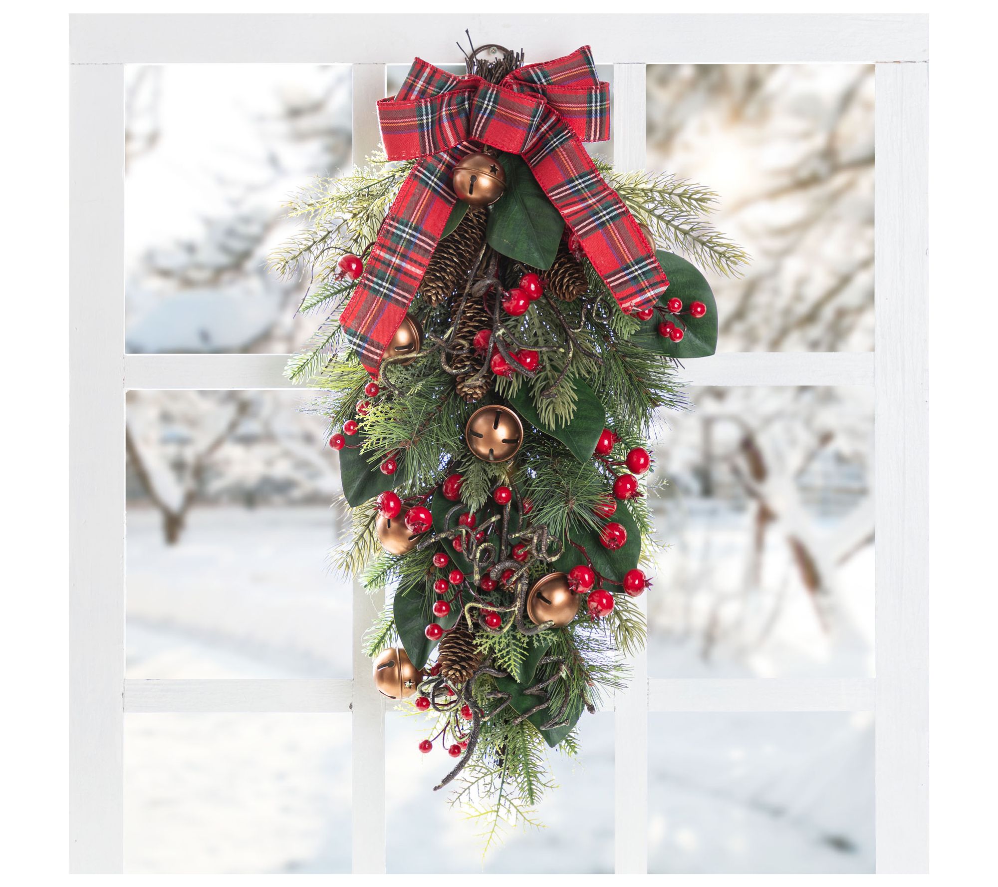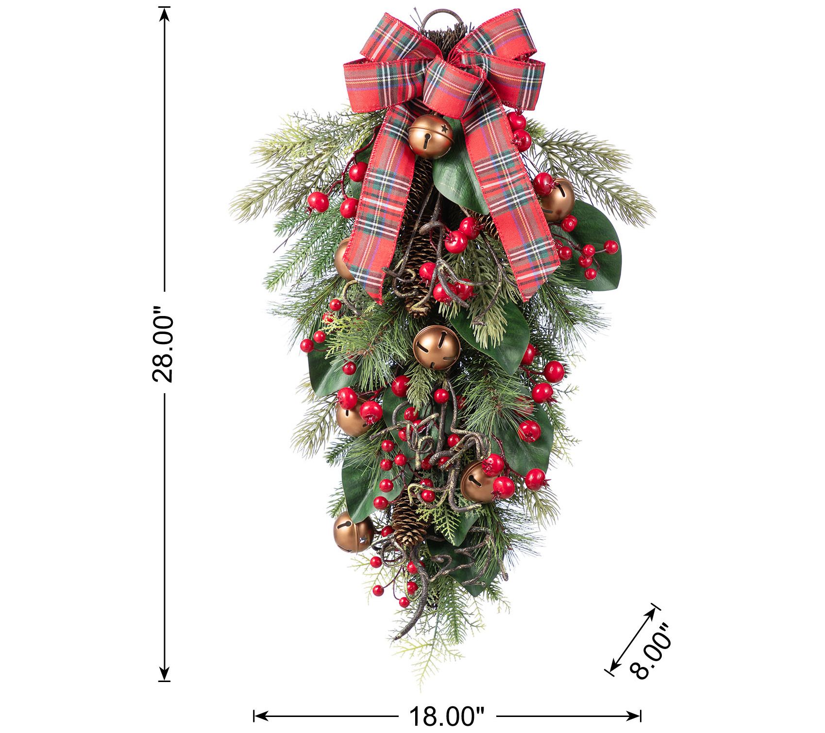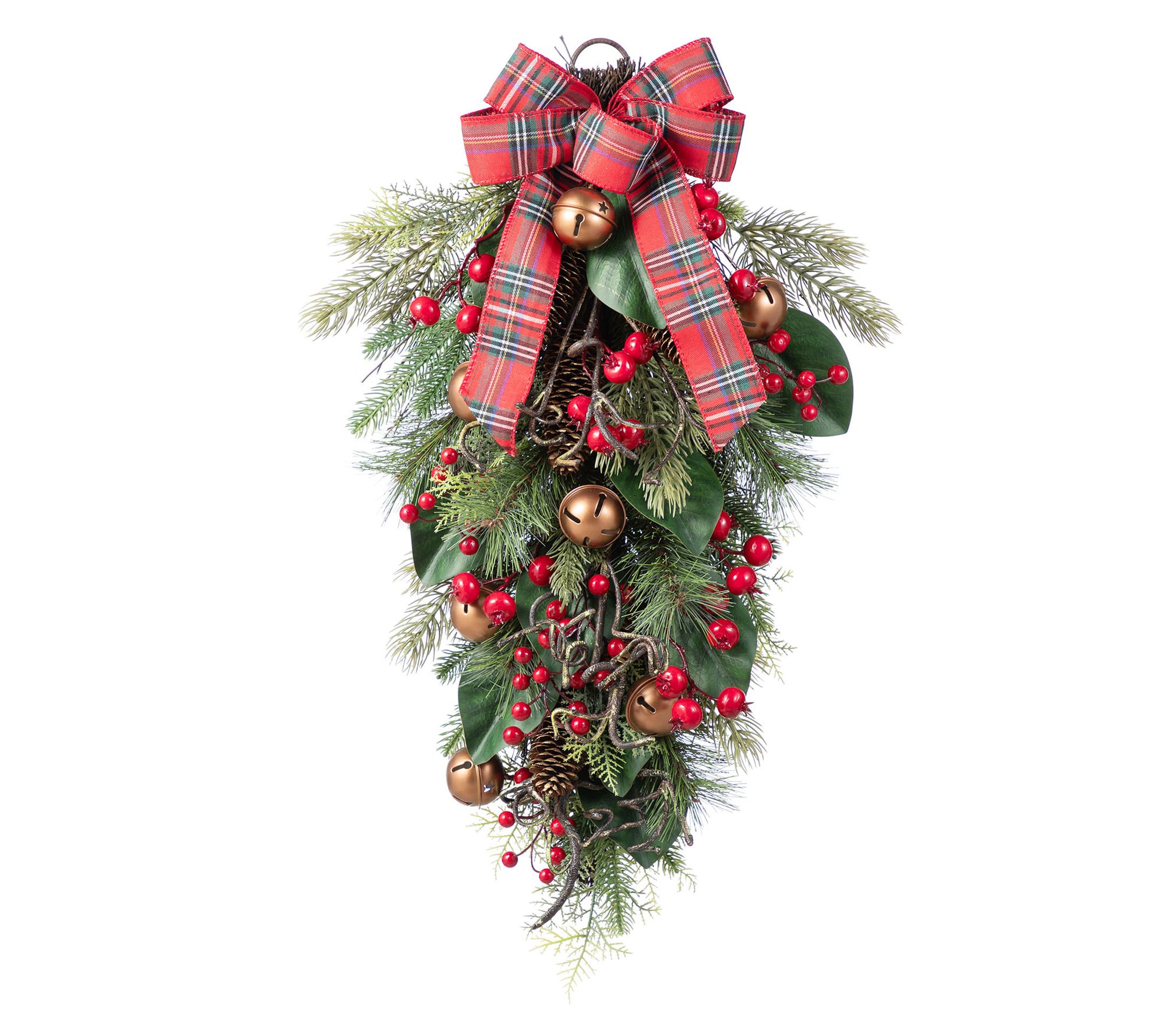 Welcome guests with an eye-catching display of festive charm -- this Christmas bell, pinecone, and berry bow teardrop adds instant holiday spirit to your entryway or living room. Lively green pine needles, shiny copper-hued bells, and bright red berries come together with a plaid bow for a joyful accent you'll love all season. From Glitzhome.