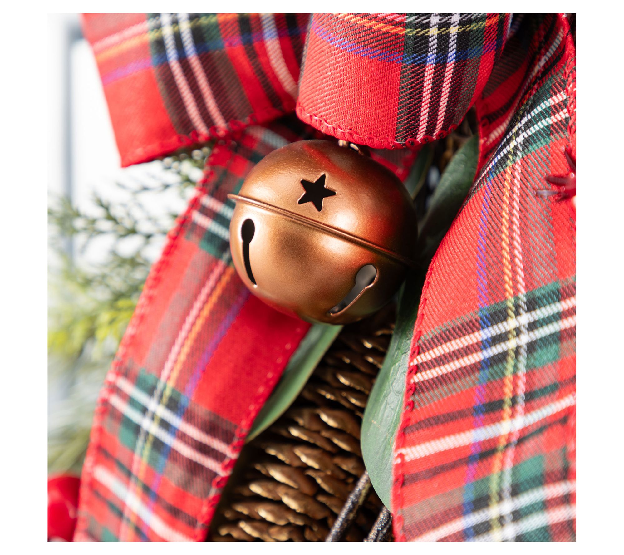 • Accented with plaid bow, coppertone bells, pinecones, and red berries