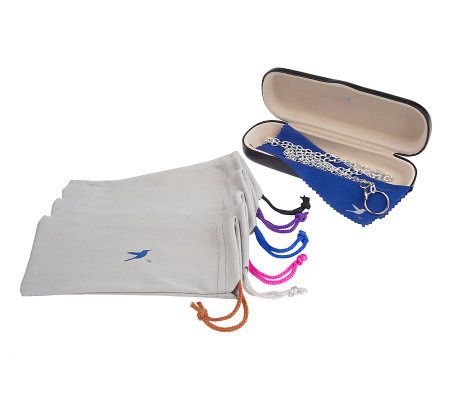 You also get everything you need to take care of your readers: six color-coordinating carrying pouches to keep your glasses free of dust and scratches; one hard case for protection while traveling; a fashionable chain to keep your lenses handy; and a cleaning cloth.