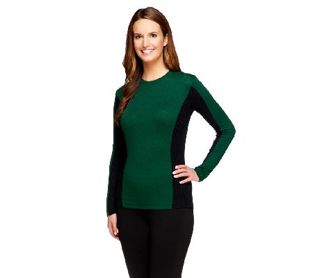 Long sleeves, scoop neckline, color block ribbed side panels, pullover style
