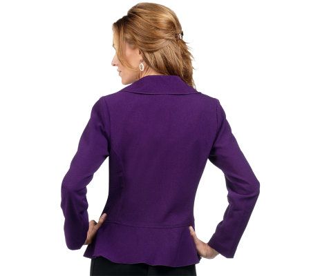 Ruffle up your closet. Add Joan-approved style to your wardrobe with this stunning jacket, which boasts ruffles along the neckline, down the front, and at the hemline. Front and back princess seams provide a fitted look that naturally follows the lines of your body. From the Joan Rivers Classics Collection(TM).