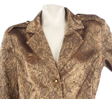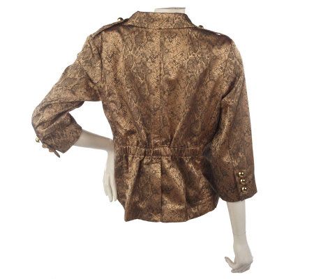Assert your fashion prowess in this metallic, python-patterned jacket. Buttons along the front placket, flap pockets, and sleeve cuffs add even more panache to the topper, while gathered ruching in the back helps to accentuate your silhouette. From the Joan Rivers Classics Collection(TM).