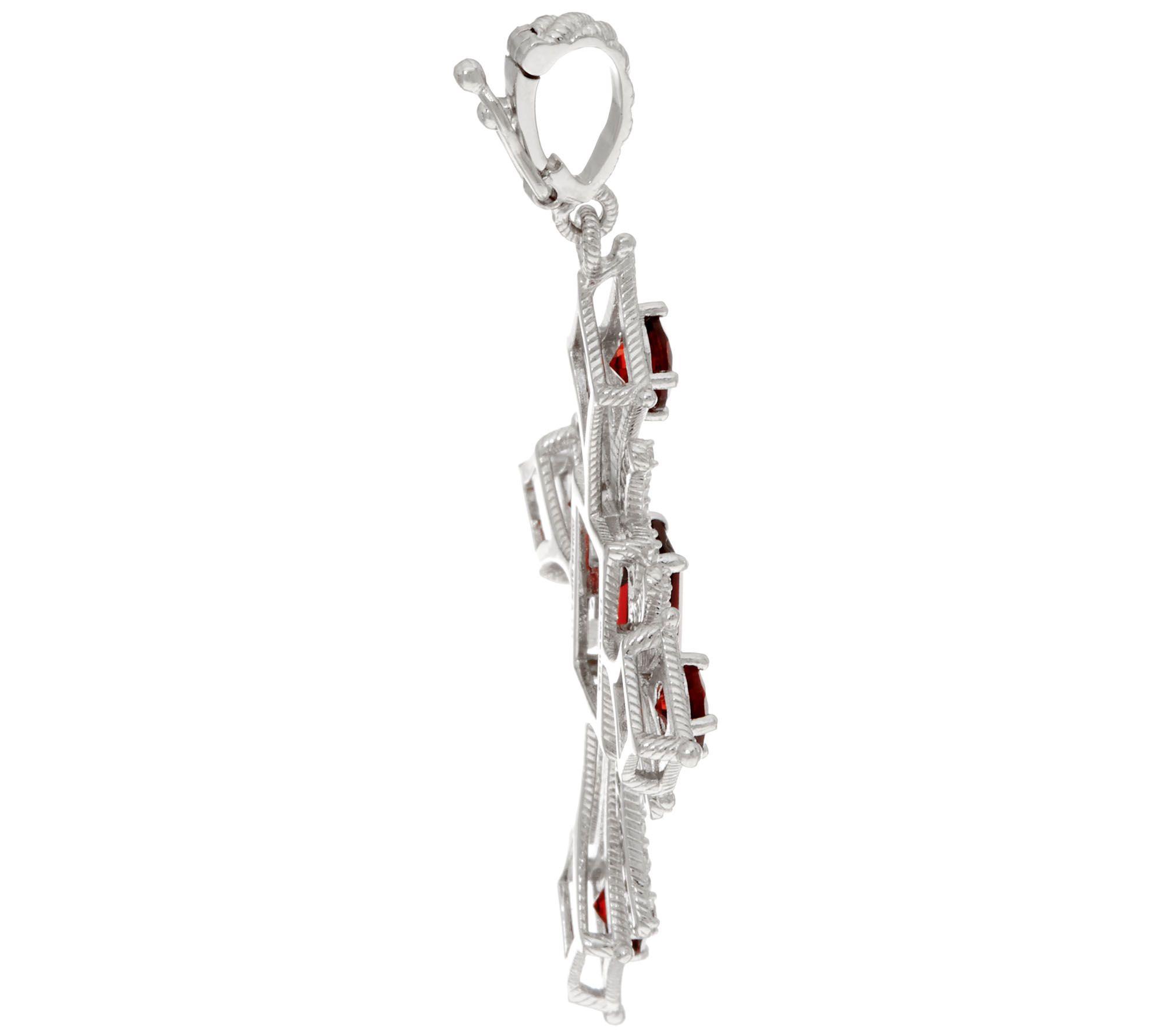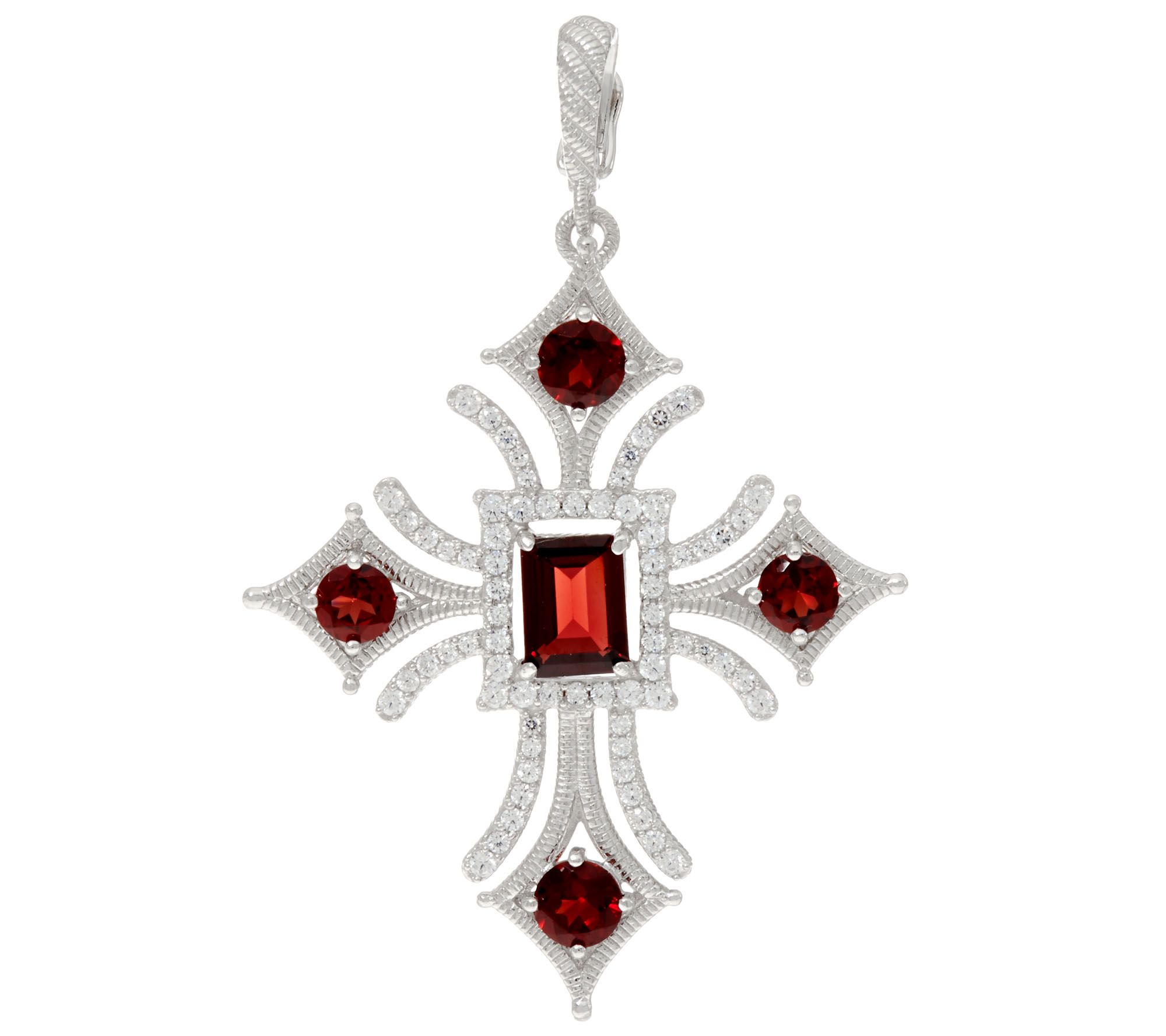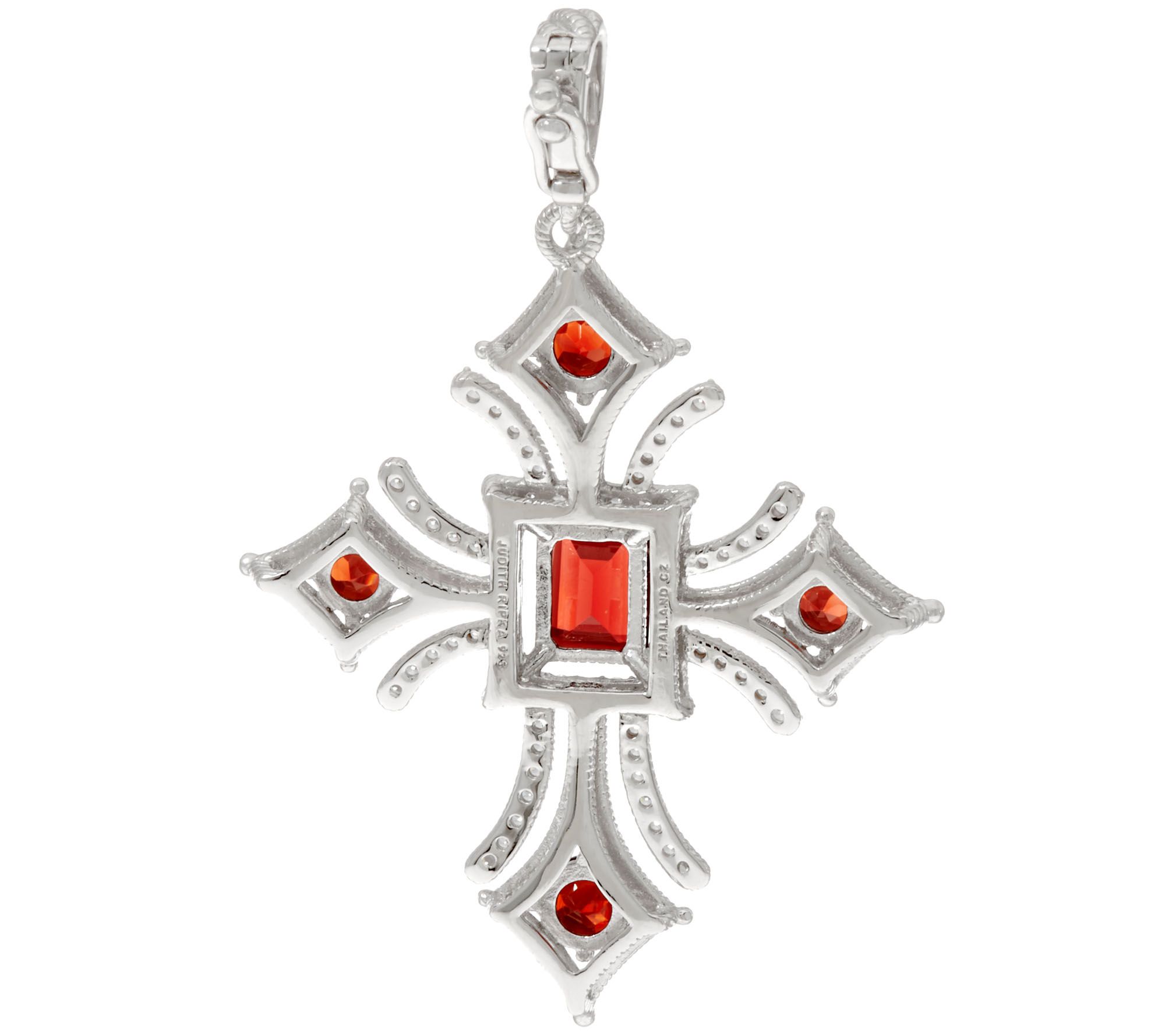 Prong-set, octagon-shaped garnet at center; round garnet in arms of cross; prong-set, round Diamonique simulated diamonds surround center and sterling silver bars; twisted-rope berge motif accents