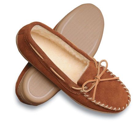 Just right for the man in your life, these pile-lined Minnetonka Moccasin slippers keep his feet toasty warm on cool, crisp nights. The hard sole allows them to be worn indoors and out. Leather ties provide an adjustable fit.