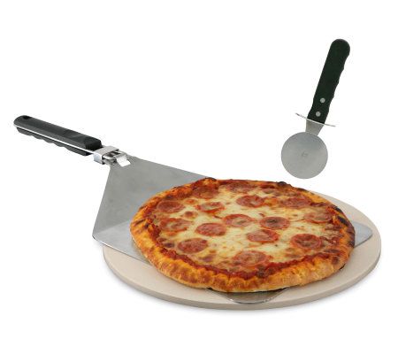 • Includes 15"Diam grill-top pizza stone, over-sized spatula, and pizza cutter
