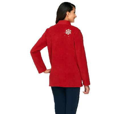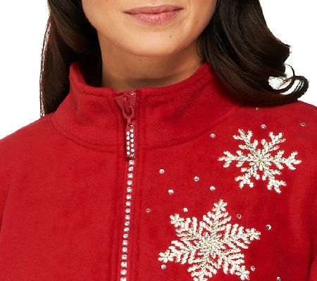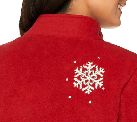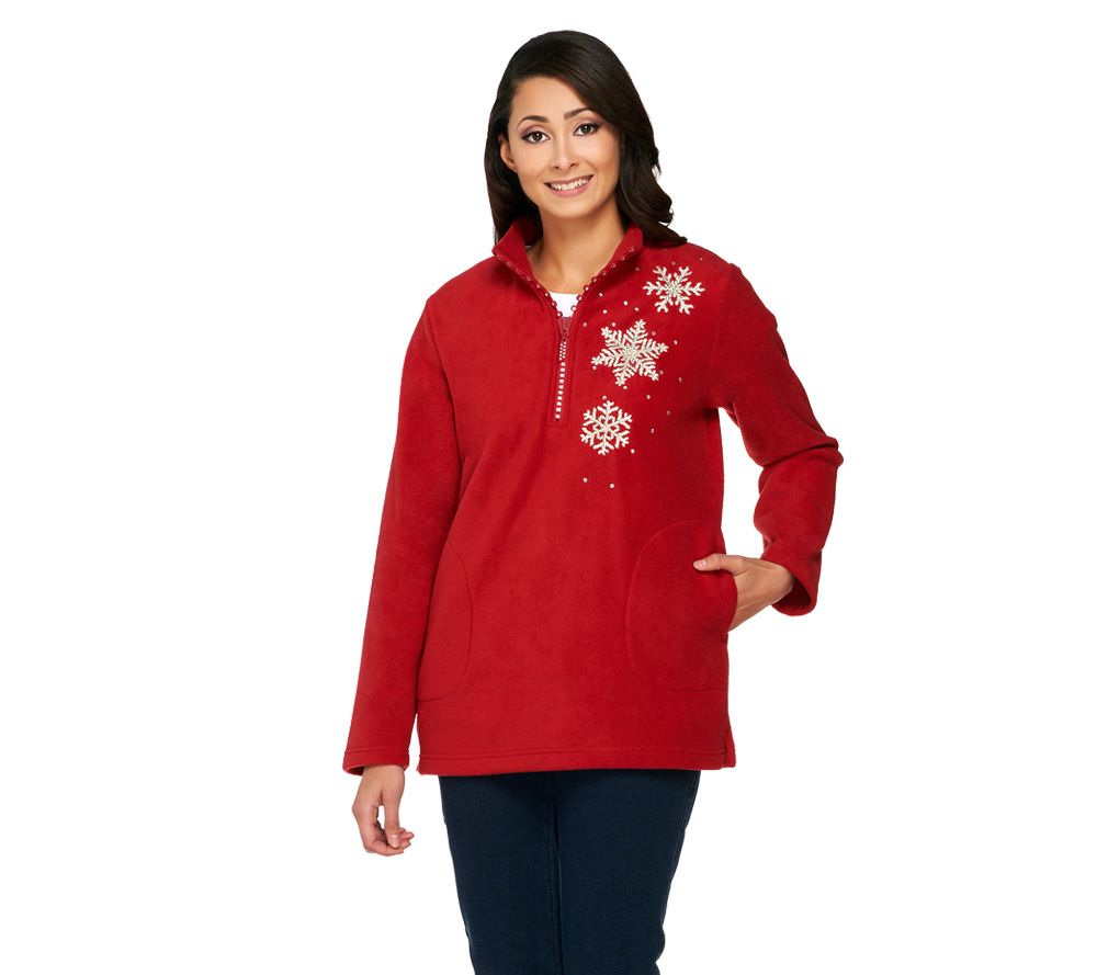 Warm, comfy, and too cute to pass up, this fleece pullover is a cold-weather favorite. Rhinestone embellishments and decorative embroidery provide a sprinkling of flair. From Quacker Factory(R).