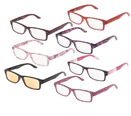 This smart collection comes with six pairs of magnification readers--perfect for seeing small print--and one pair of computer readers. The computer reader's amber/yellow lenses tone down harsh florescent light.