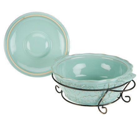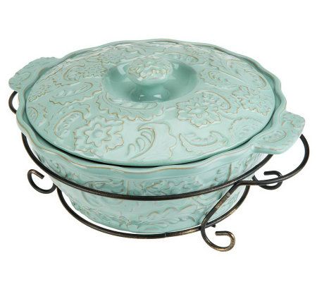 It almost doesn't matter what's inside this covered baker. It's so beautiful, it'll be the star of any dinner table. The embossed design on the sculpted, handpainted piece gives it a gorgeous look. From Temp-tations(R) Ovenware.
