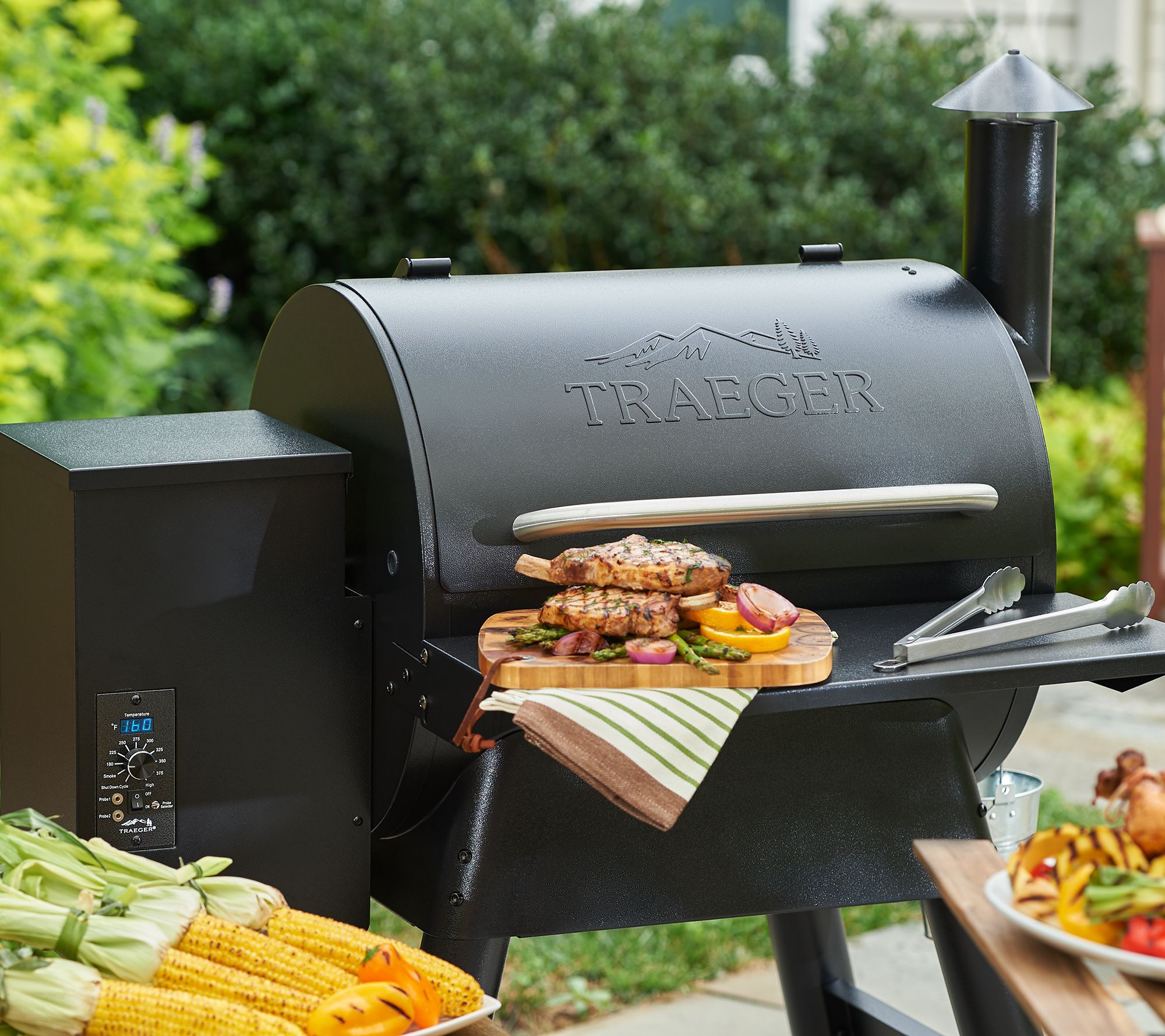 • Includes TFB57-XXX Traeger Ridgeland grill and smoker, two temperature probes, fold-down front shelf, all-weather cover, 20-lb bag of hickory hardwood pellets, and 20-lb bag of mesquite hardwood pellets