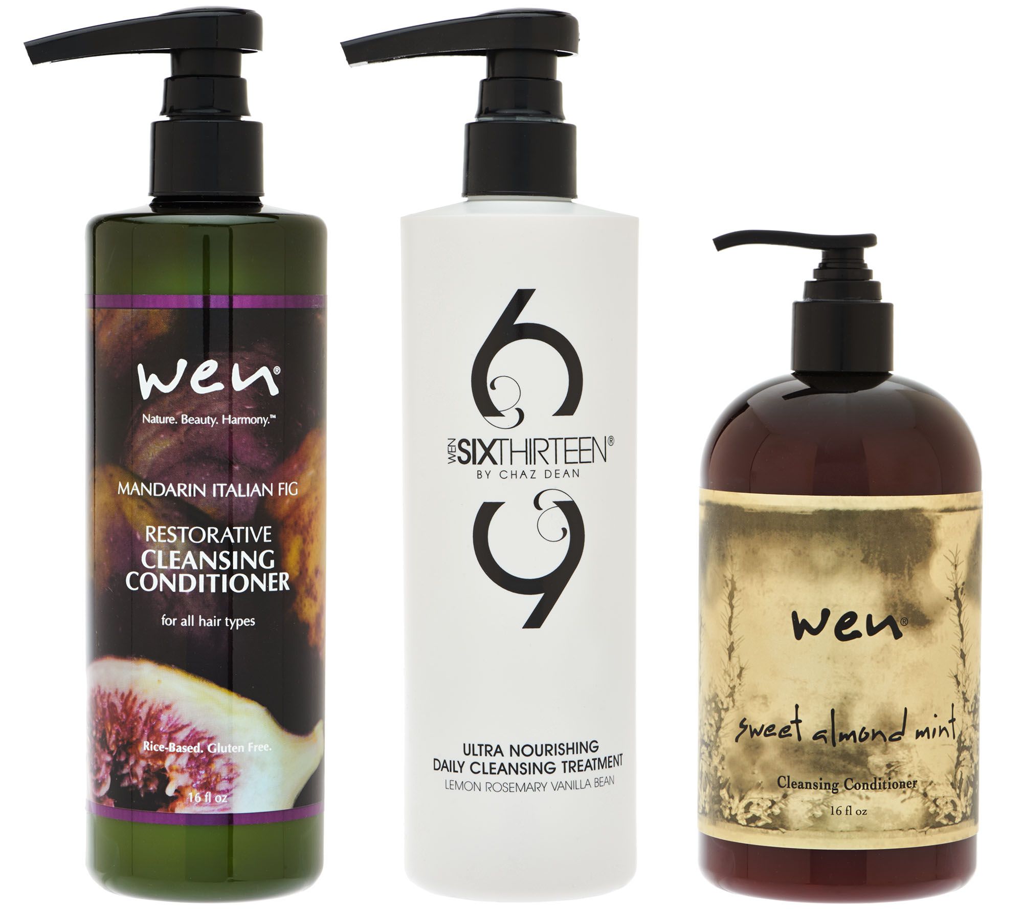 What is it: This WEN by Chaz Dean set of three universal Cleansing Conditioners combines three formulas into one amazing kit. From the core line, you'll receive a 16-oz Sweet Almond Mint Cleansing Conditioner, WEN's original core Cleansing Conditioner. You'll also receive a 16-oz Mandarin Italian Fig Cleansing Conditioner from the rice-based line--enhanced with the 4-Tea complex--as well as a 16-oz Six Thirteen Daily Cleansing Treatment.