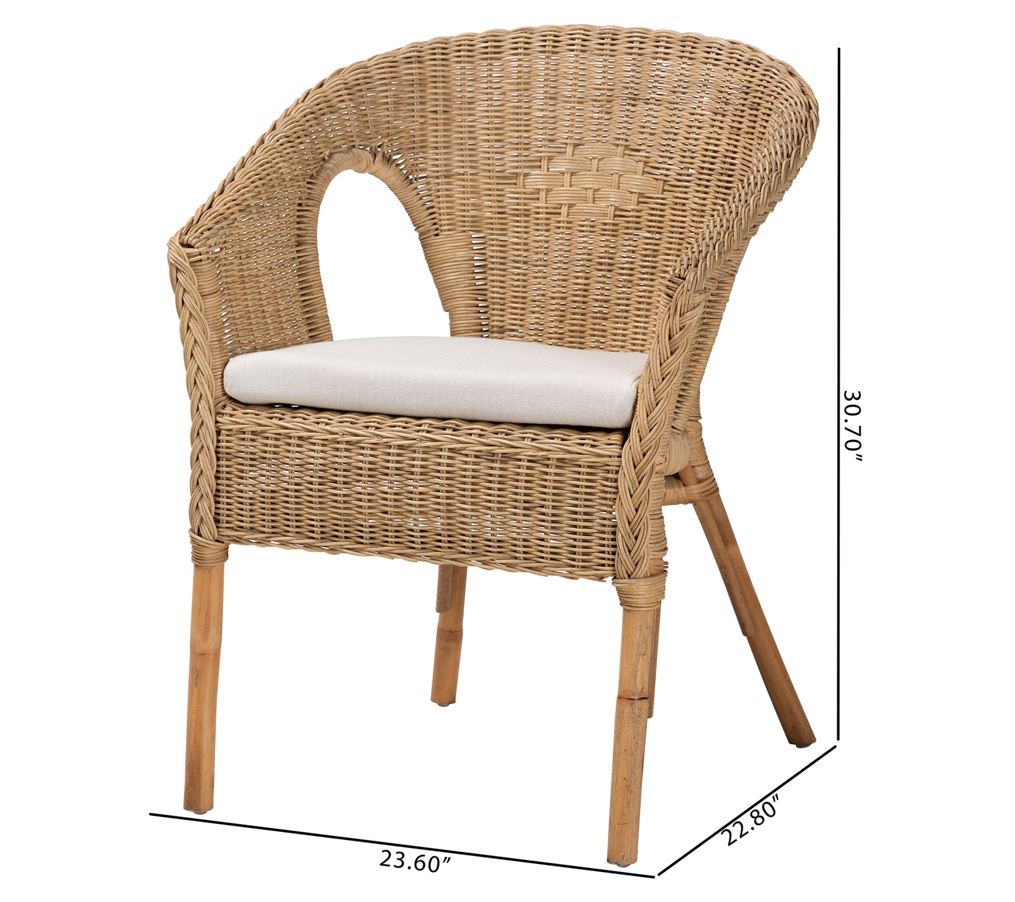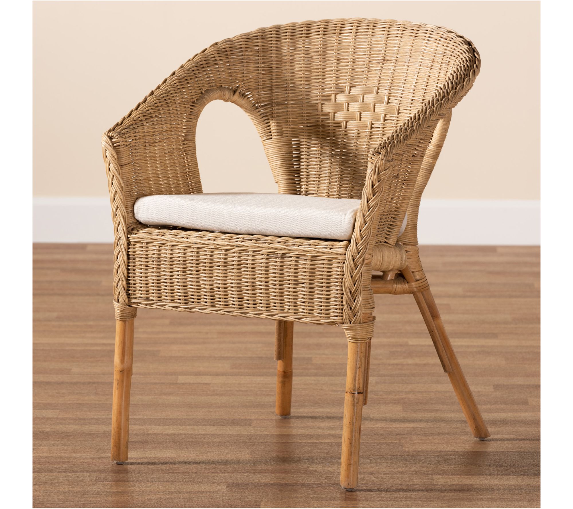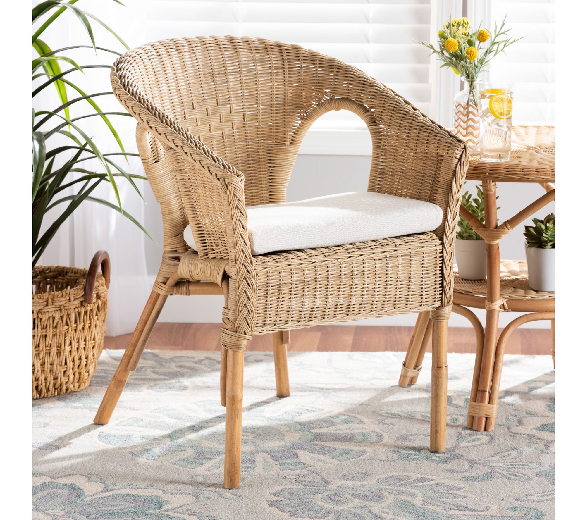 Designate a tranquil corner in your home to rejuvenate or bring a touch of tropical beauty to a dining area with the Abbey, a lovely armchair with an earthy rattan frame, a gently curved back, and a plush upholstered seat cushion. From Baxton Studio.
