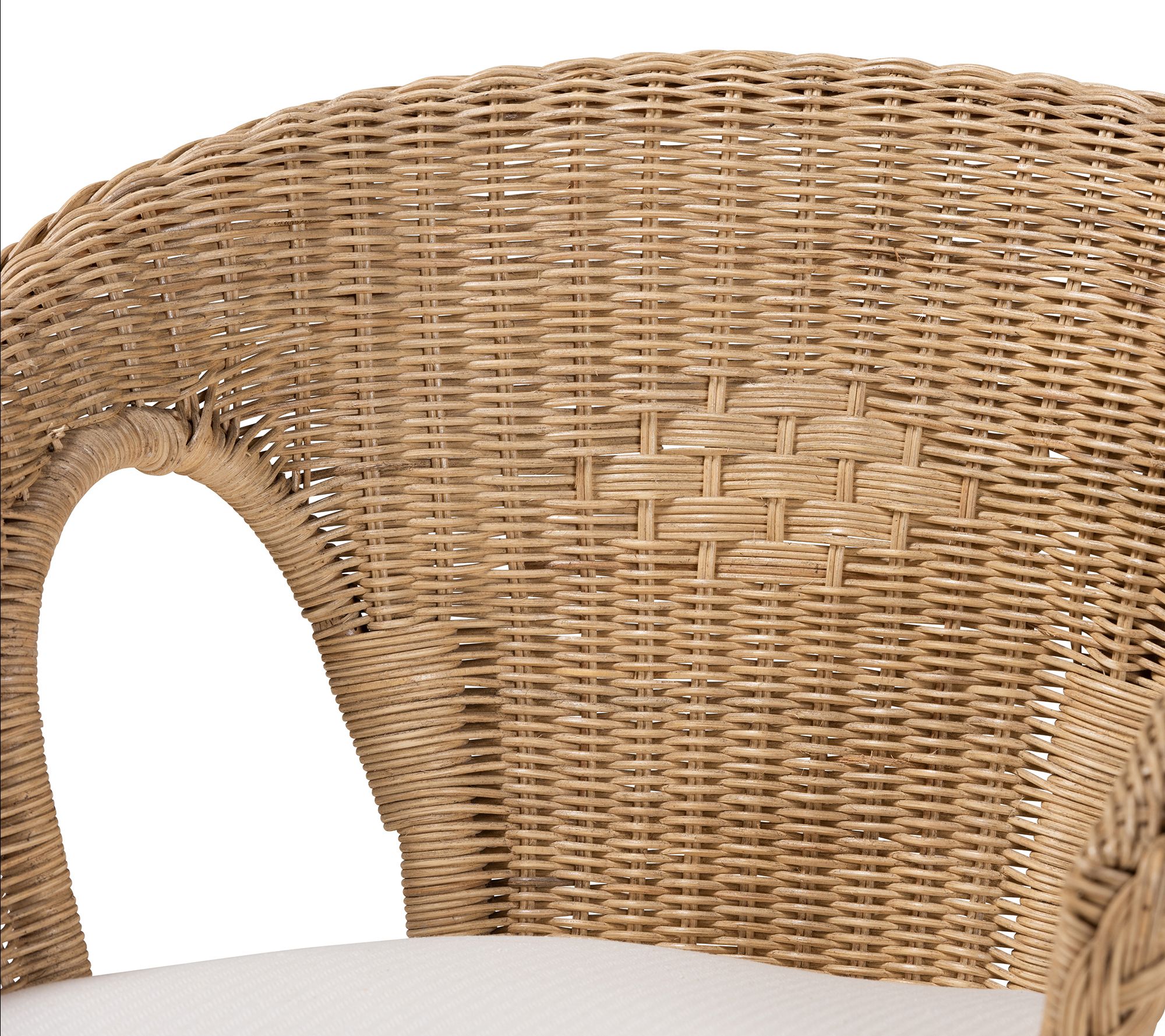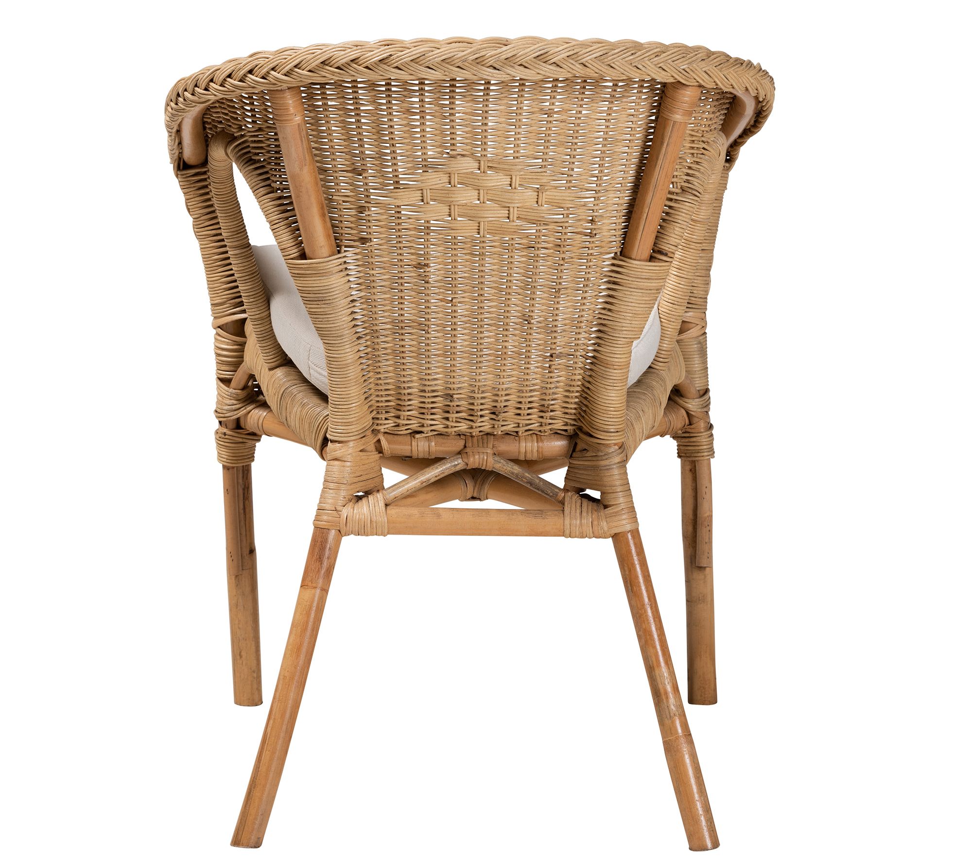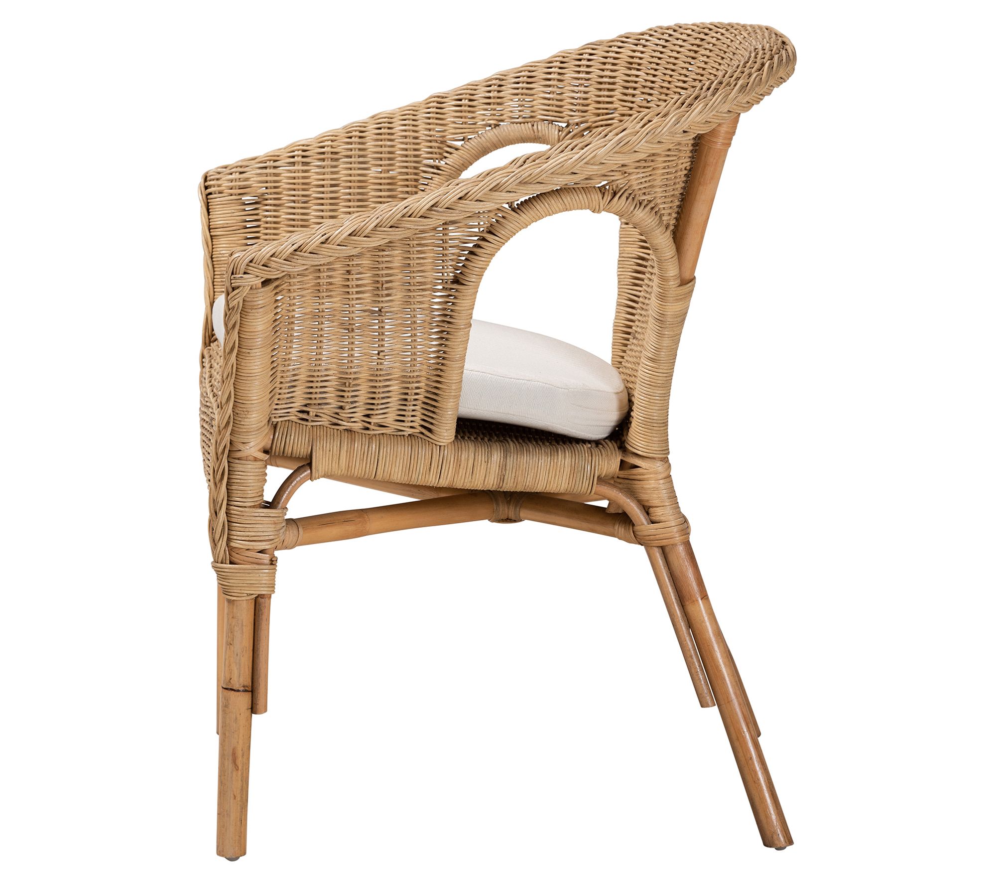 Designate a tranquil corner in your home to rejuvenate or bring a touch of tropical beauty to a dining area with the Abbey, a lovely armchair with an earthy rattan frame, a gently curved back, and a plush upholstered seat cushion. From Baxton Studio.