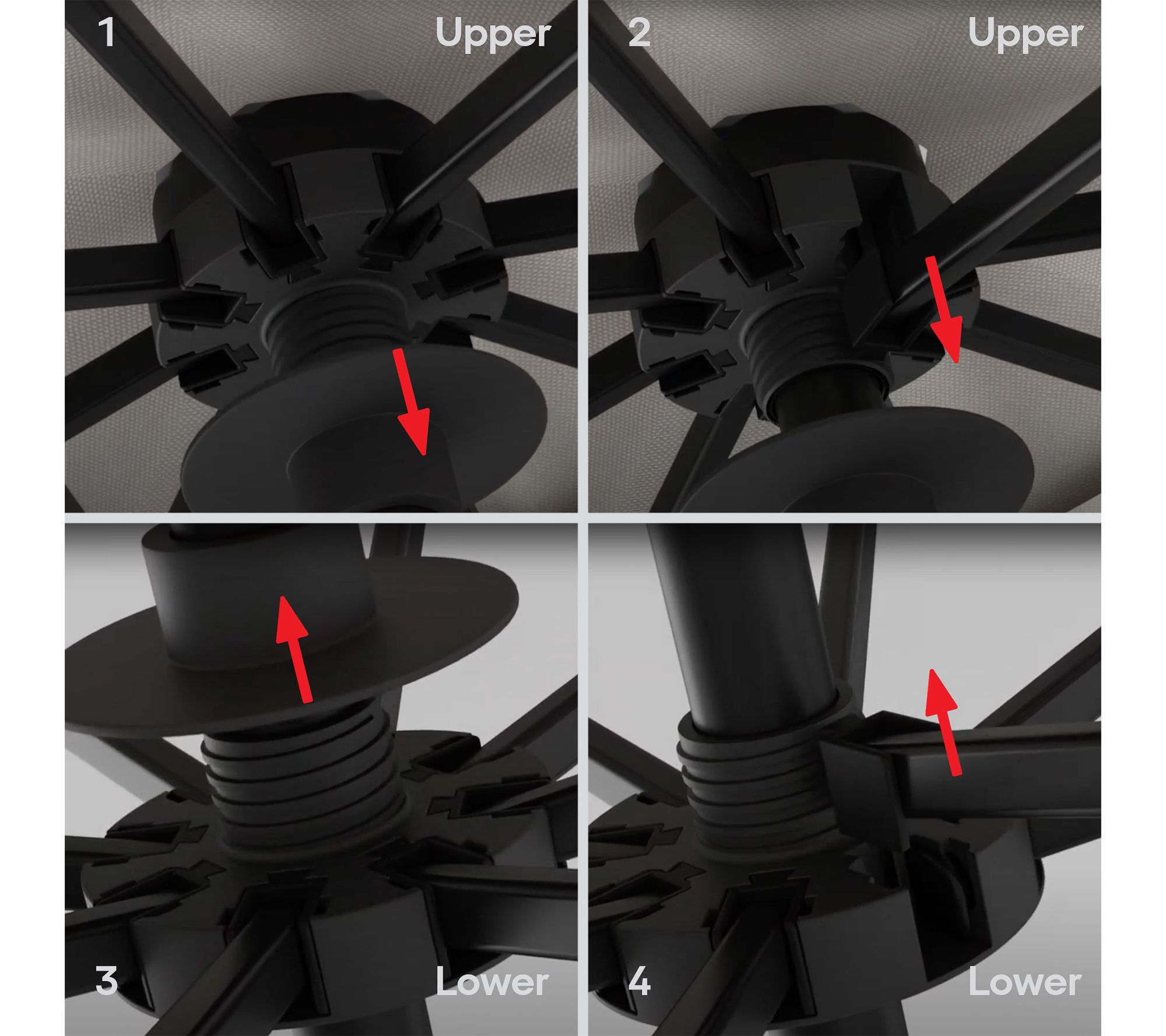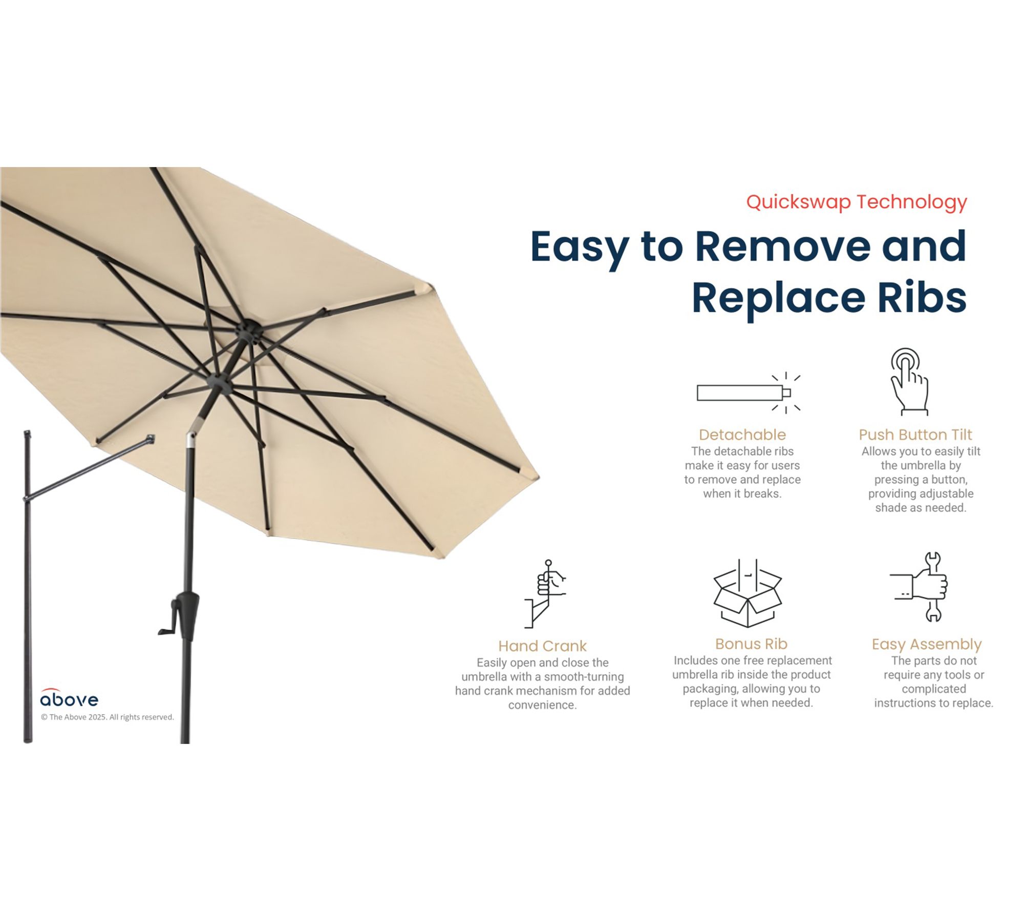 Includes umbrella, bottom pole, bonus replaceable rib, and setup guide