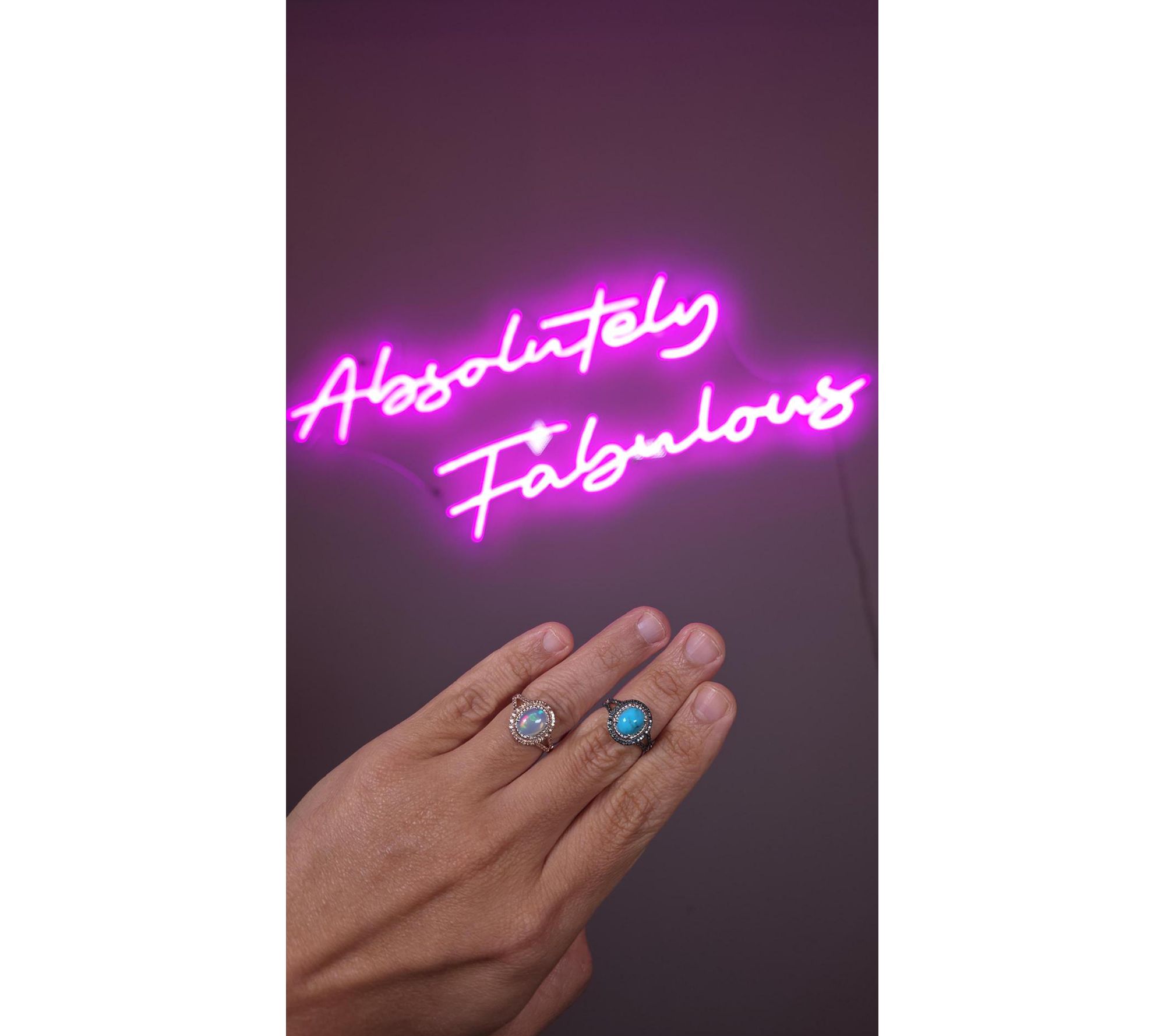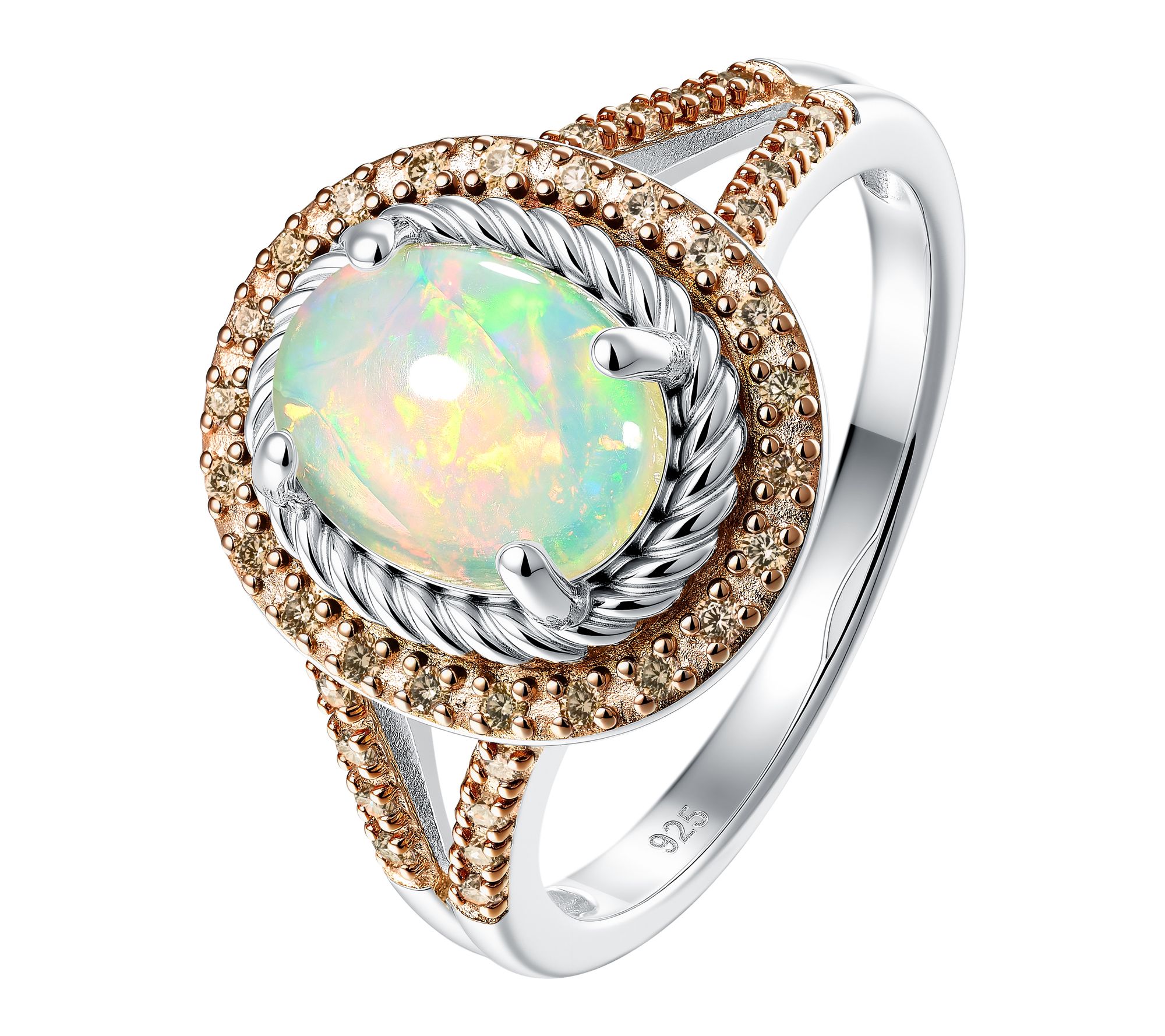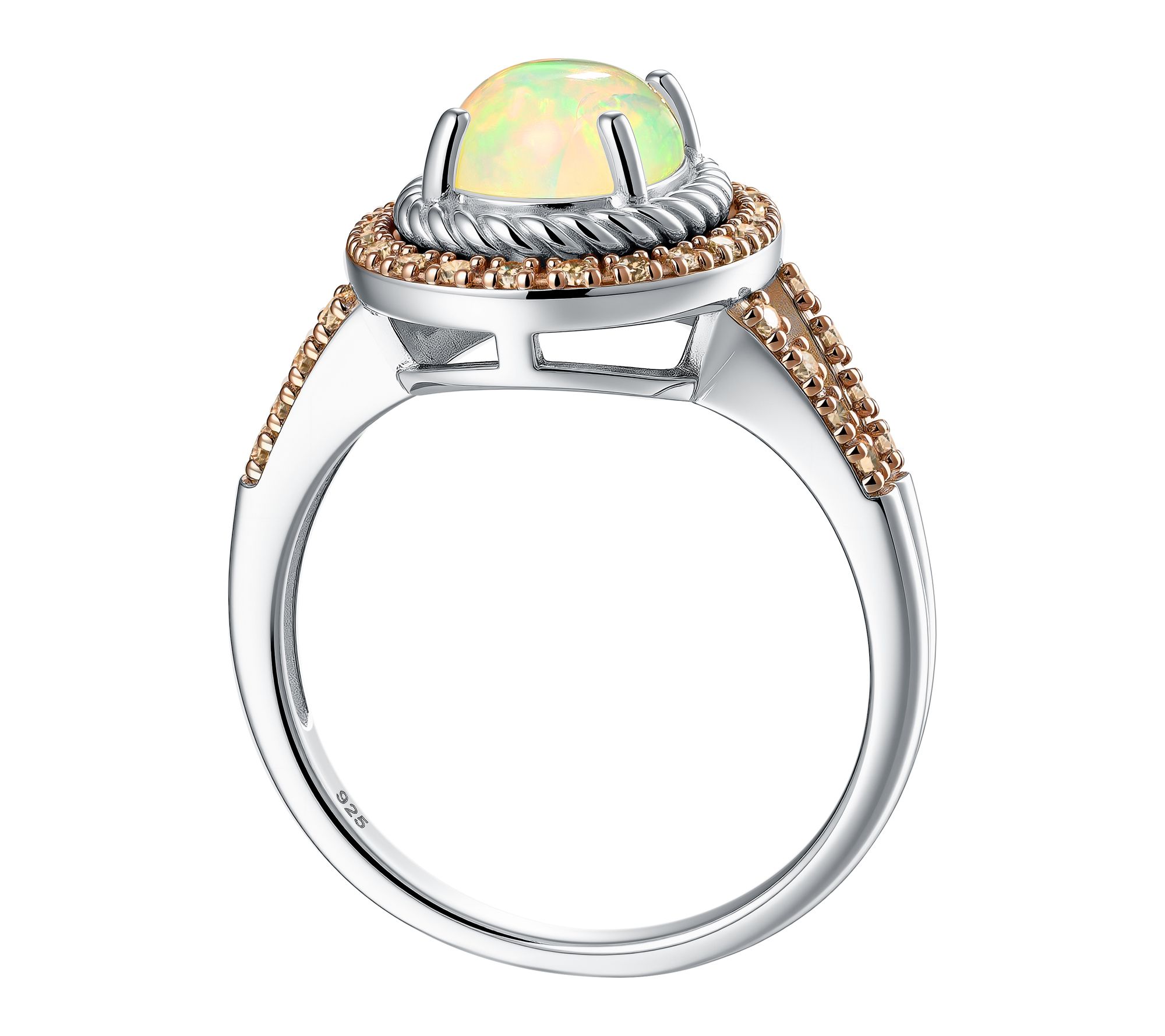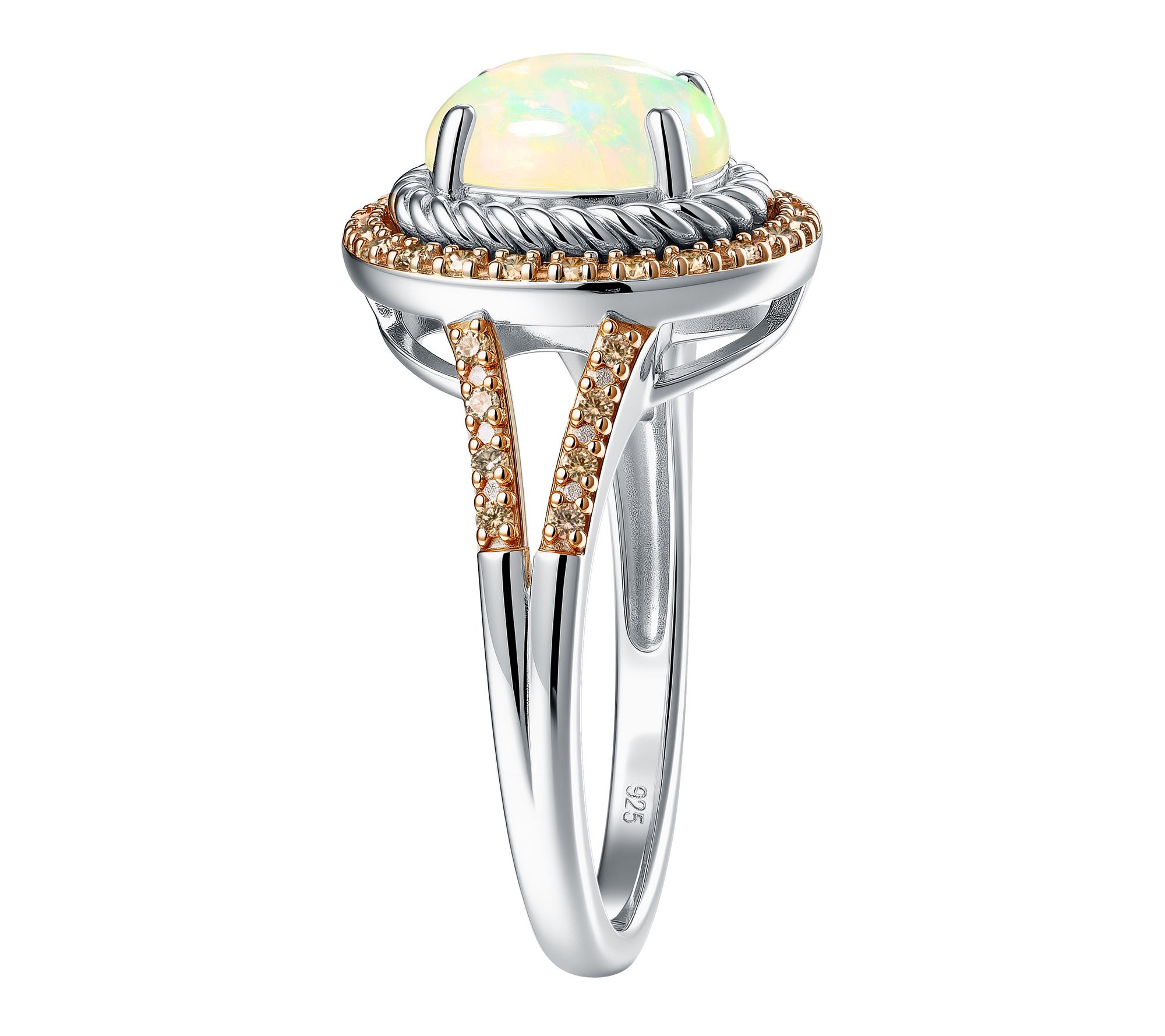 • Ethiopian opal gemstone center; brown diamond halo; split shank