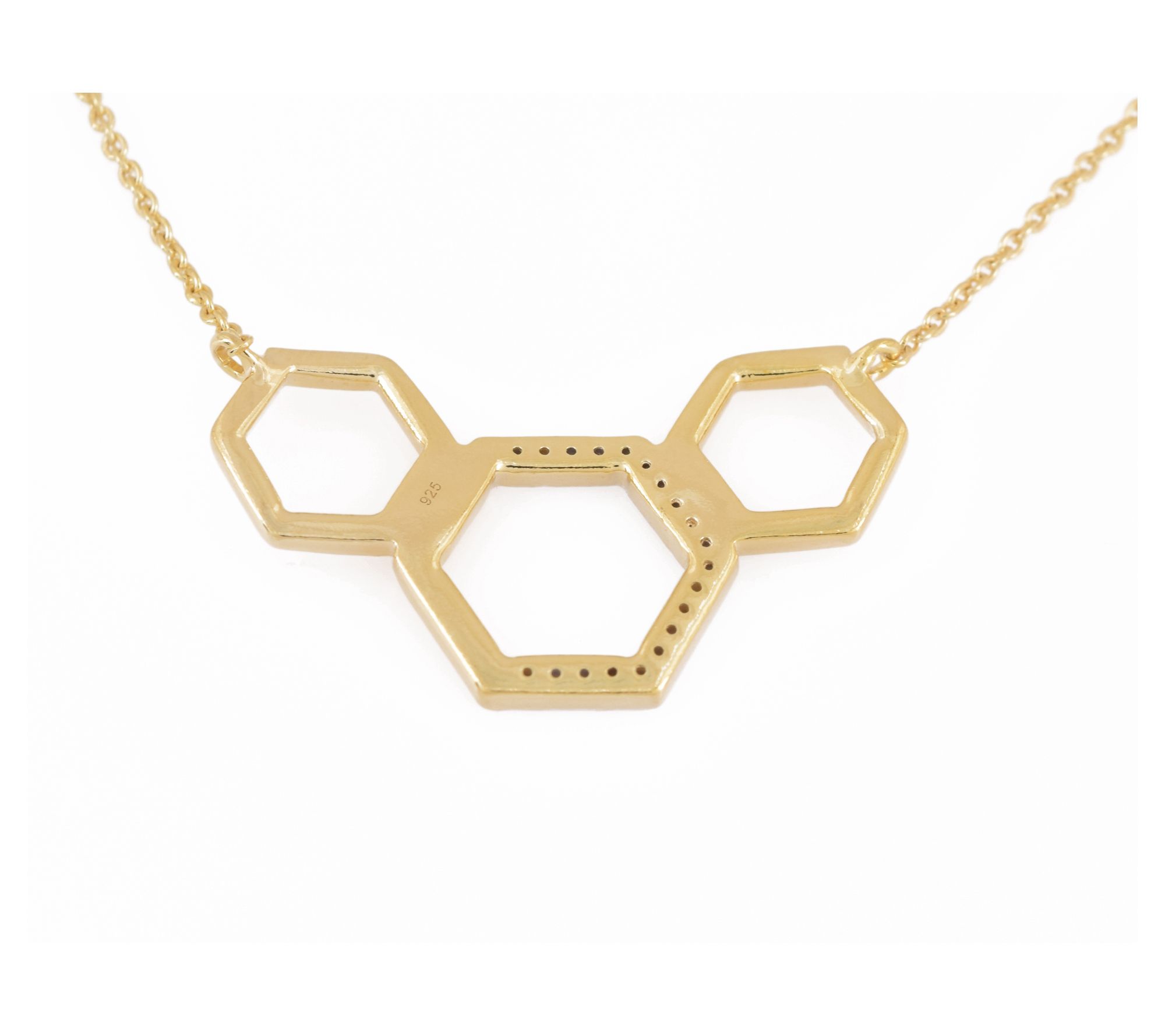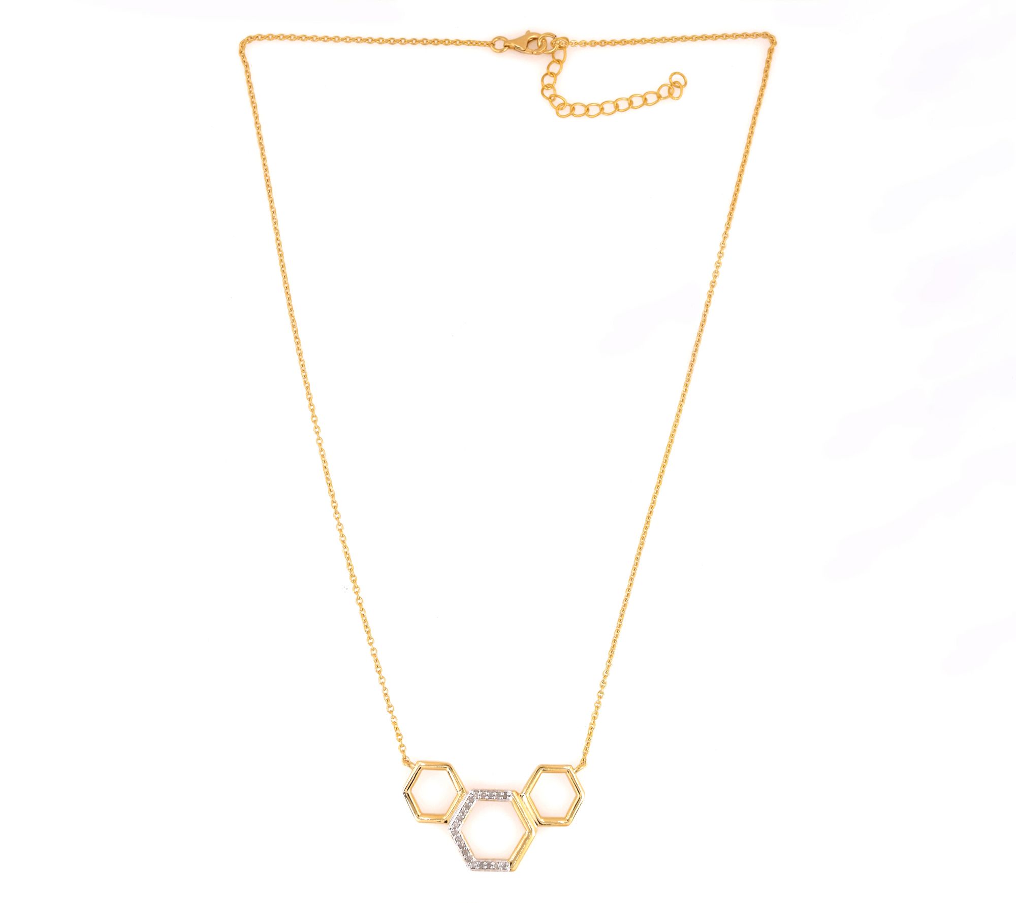 The dazzling accents of this necklace elevate your everyday style. An intricately designed hexagon pendant glistens with round-cut diamonds against a backdrop of 14K yellow gold-plated sterling silver. The lobster claw clasp ensures that this piece remains securely in place. Perfect for adding a touch of sophistication to your neckline, whether you're dressing up for a special occasion or adding a bit of glamour to your everyday look. From Accents by Affinity.