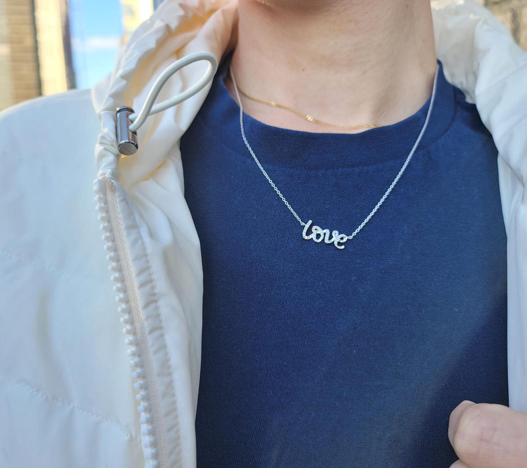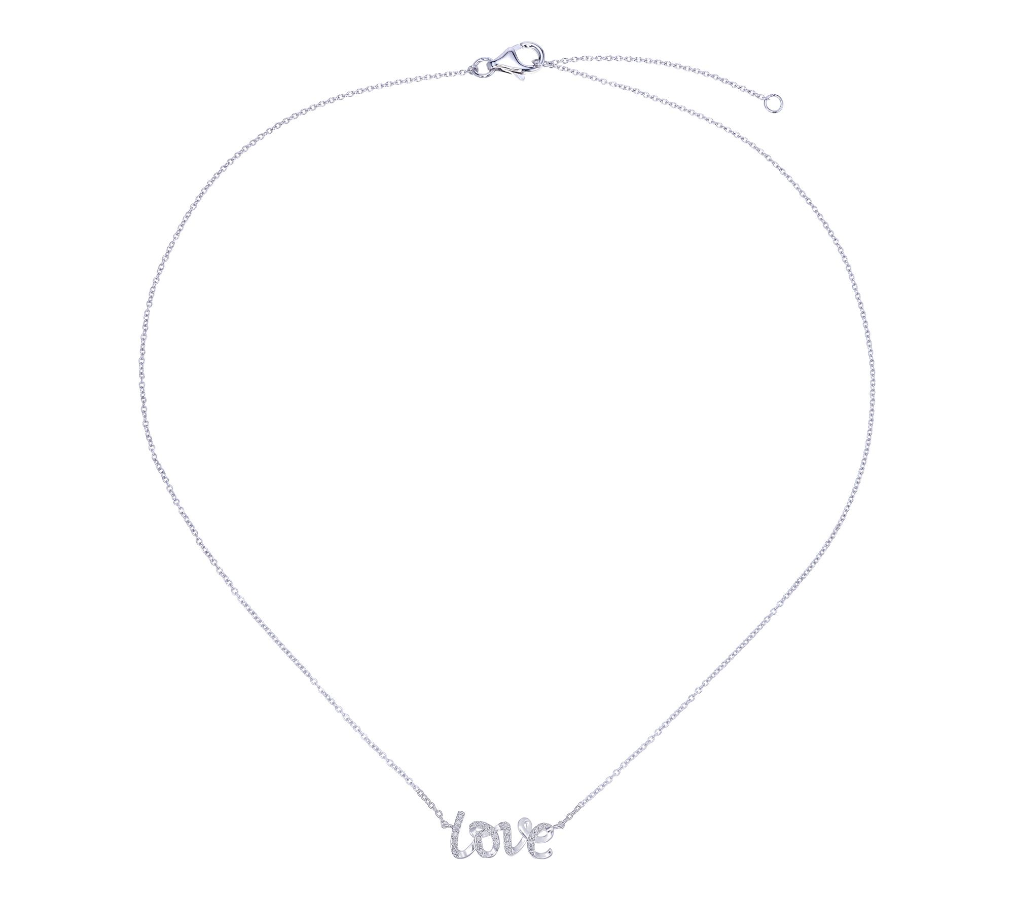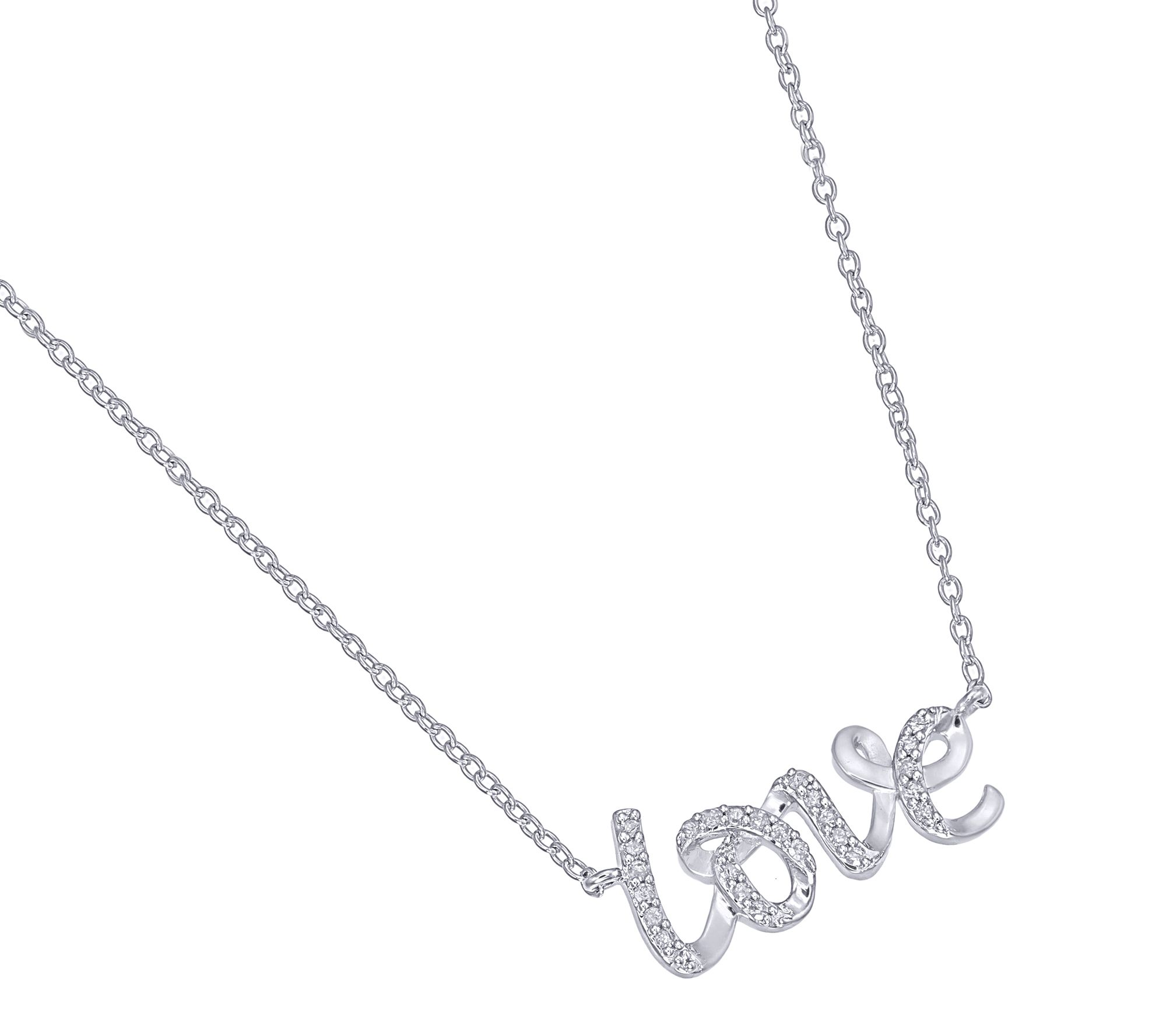 - LOVE charm; pave-set diamond accent; cable link chain
